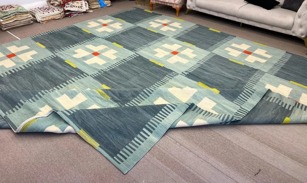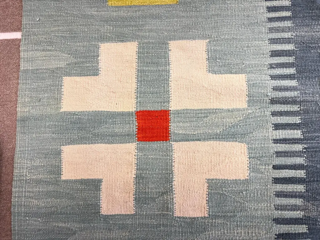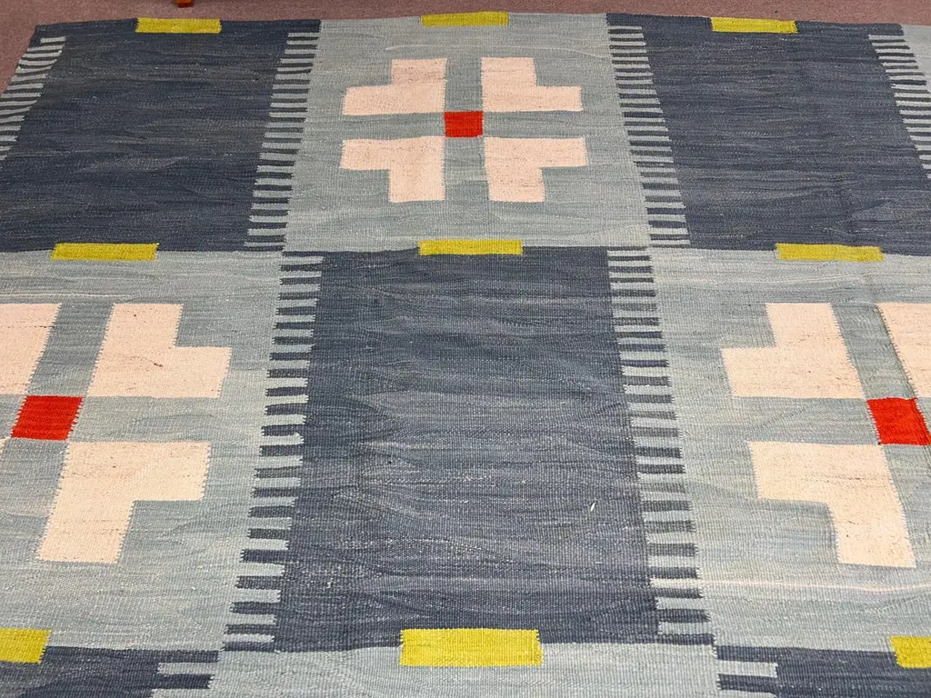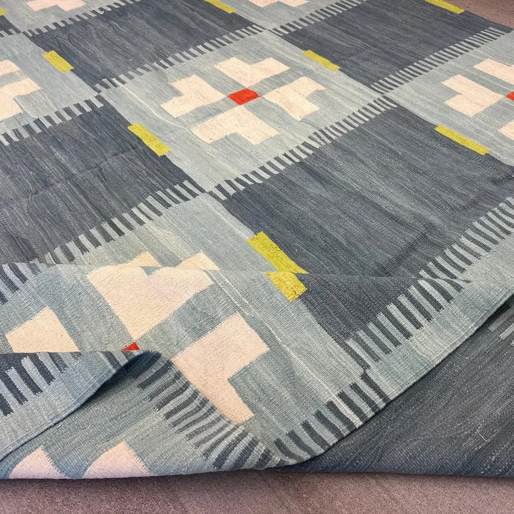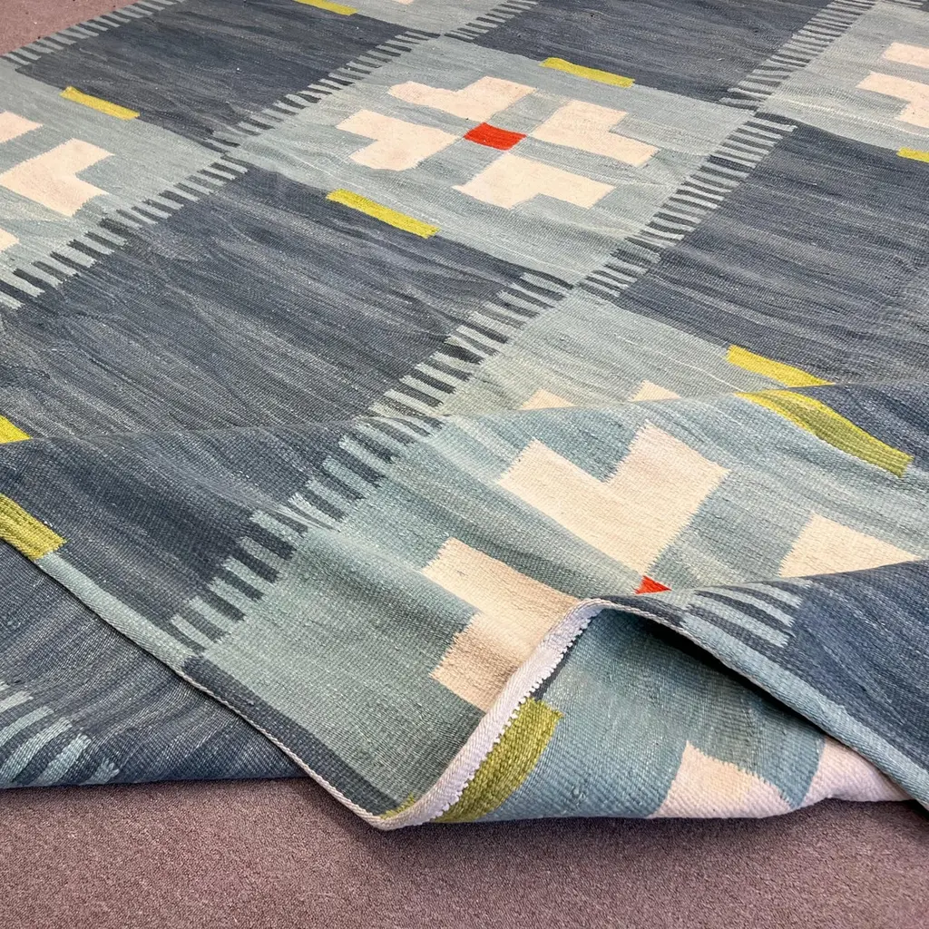 Embrace the simplicity and elegance of Scandinavian design with this flat-weave Turkish kilim rug, crafted from 100% wool. This unique piece beautifully blends Nordic minimalism with traditional Turkish craftsmanship, showcasing geometric patterns and clean lines that reflect a modern yet timeless aesthetic.Handwoven by skilled artisans, this kilim rug features a durable flat-weave construction, making it lightweight, versatile, and easy to maintain. The 100% wool composition offers a soft, natural texture, while its minimalist design and nice color palette complement a variety of interior styles, from modern Scandinavian to bohemian chic.Features:✔ Scandinavian-inspired design with geometric patterns and clean lines✔ Handwoven in Turkey by skilled artisans using traditional techniques✔ 100% wool construction – soft, resilient, and naturally insulating✔ Flat-weave design – lightweight, versatile, and easy to maintain✔ Minimalist elegance – perfect for modern, bohemian, or eclectic interiorsIdeal for living rooms, bedrooms, or office spaces, this Scandinavian-style Turkish kilim adds a touch of understated elegance and contemporary flair to any room. Its timeless design and superior craftsmanship make it more than just a rug—it’s a work of art that enhances your living space.Elevate your home with Scandinavian simplicity today!Size: 14 x 14 Ft (427 x 427)Weaves: Hand-WovenMaterials: 100% WoolPile Height: LowRoom: Any Room, Guestroom, Nursery, Kid's Room, Lounge, Living Room, Kitchen, Entryway, Salon, Trailer, Home Office / Study, Garage, Foyer, Dining Room, Conservatory, Bedroom, Basement, Utility/Laundry RoomAge: NewShape: RectangleType: Area RugStyle: KilimColor: Blue CUSTOM OPTIONS AVAILABLE Ref No: D977 Please inquire about wholesale pricing