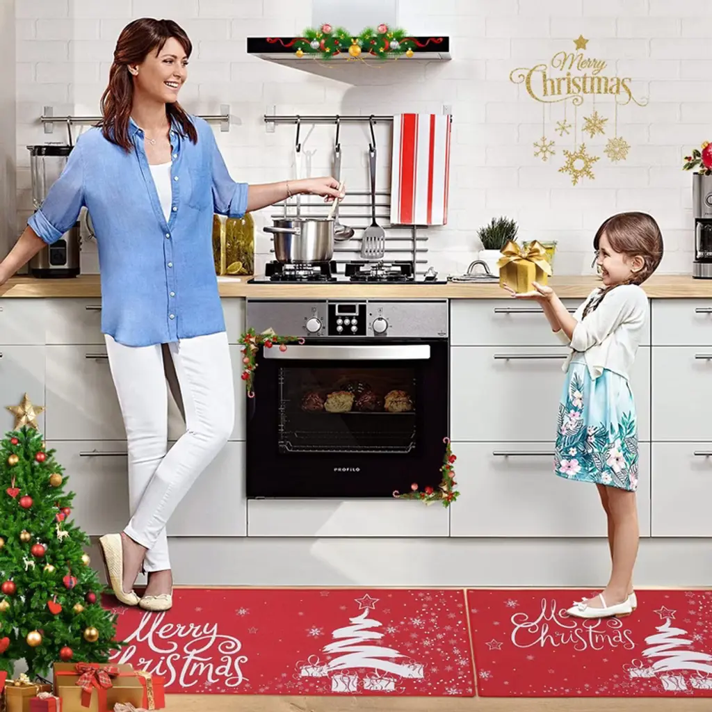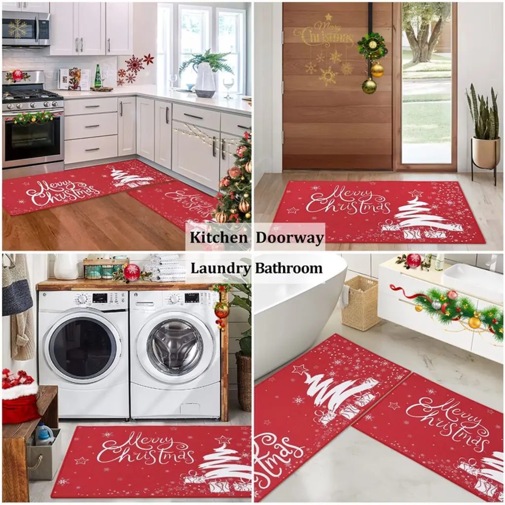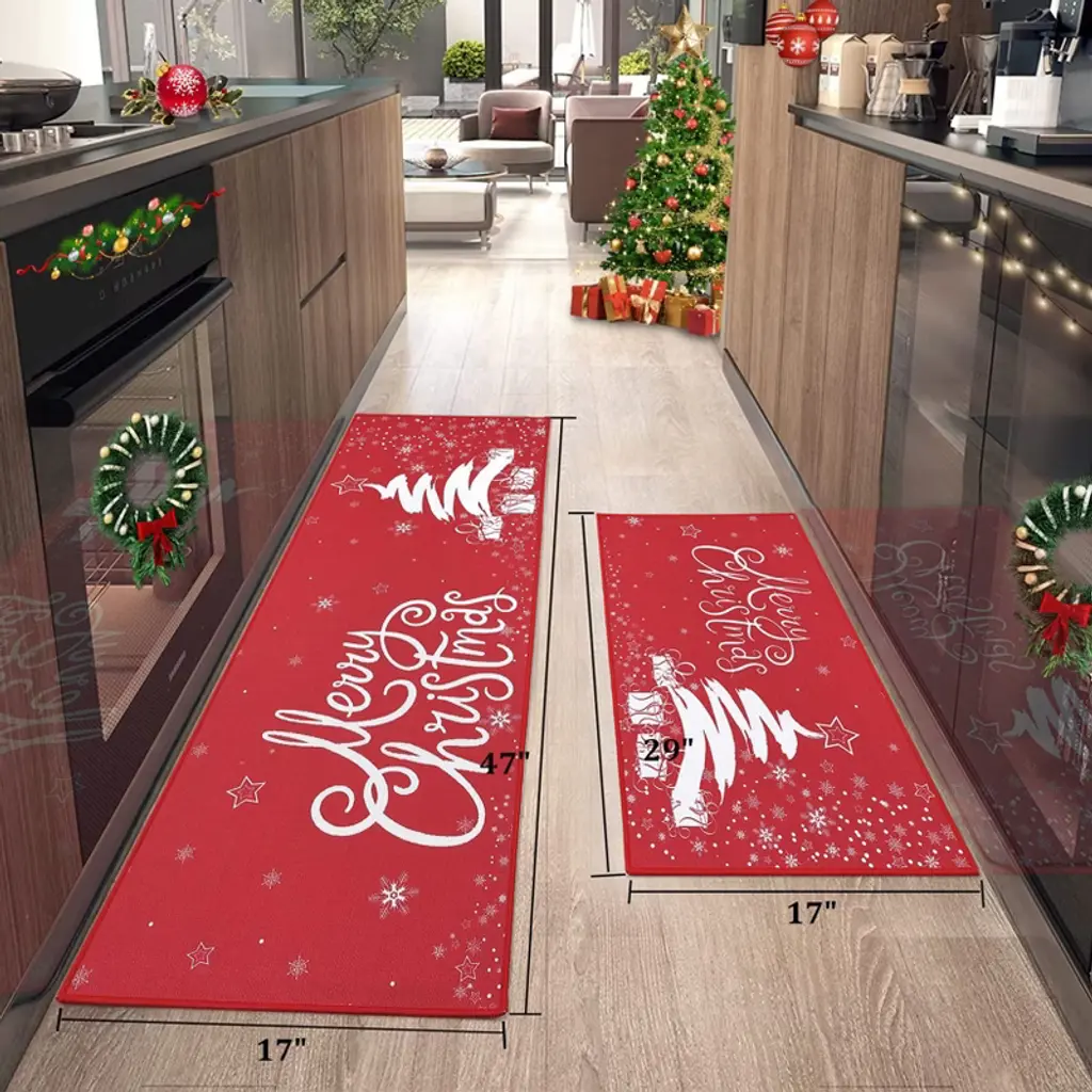 Add festive charm and cozy comfort to your home this holiday season with our Christmas Kitchen Rugs and Mats Set. This set includes two mats, sized 17x29 inches and 17x47 inches, designed to bring warmth and seasonal spirit to your kitchen or any room. Featuring a beautiful winter holiday tree and snow design in vibrant red, these mats perfectly capture the essence of Christmas decoration. Our mats are crafted with non-slip backing to ensure safety on any floor surface, preventing slips and falls even in busy kitchen areas. The non-shedding material keeps your floors clean and tidy, while the stain-resistant fabric makes maintenance simple and hassle-free. These rugs are washable, allowing you to keep them looking fresh and vibrant throughout the holiday season and beyond. Ideal for kitchens, entryways, or living areas, this set enhances your home’s festive décor while providing comfort underfoot during chilly winter days. The durable construction ensures long-lasting use, making these mats a practical and beautiful addition to your holiday decorations.