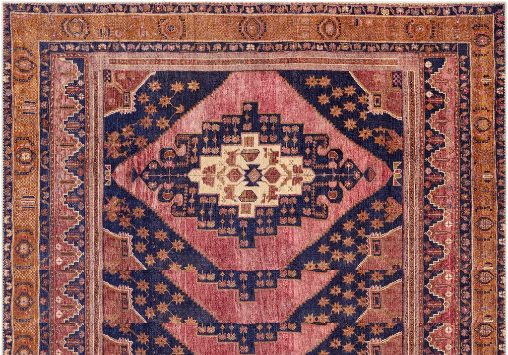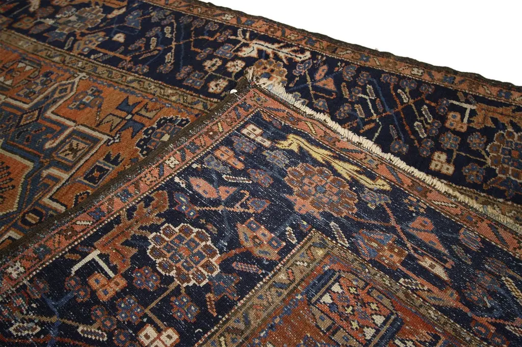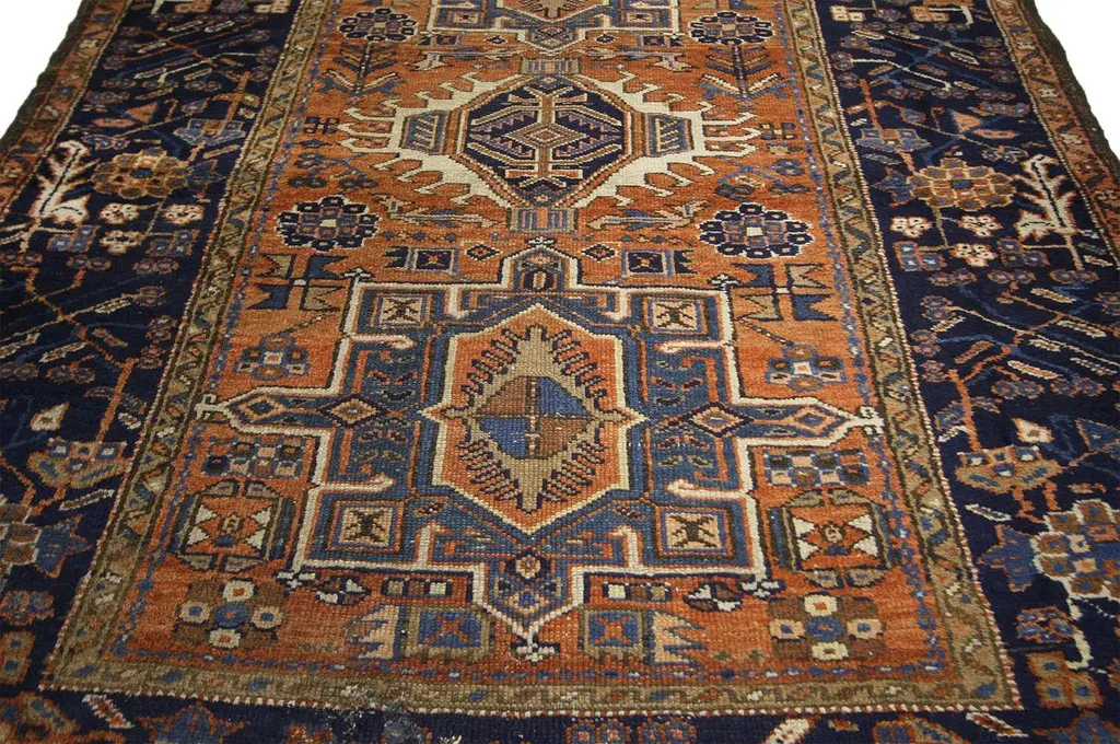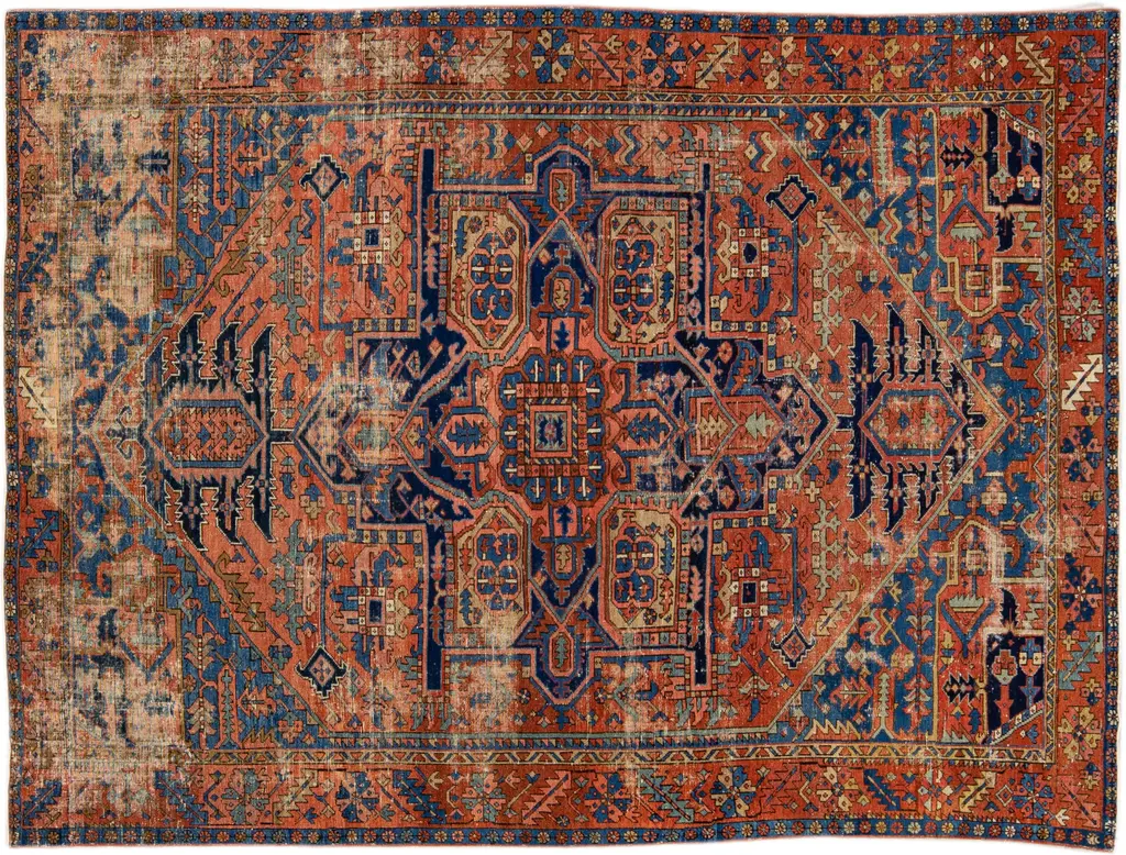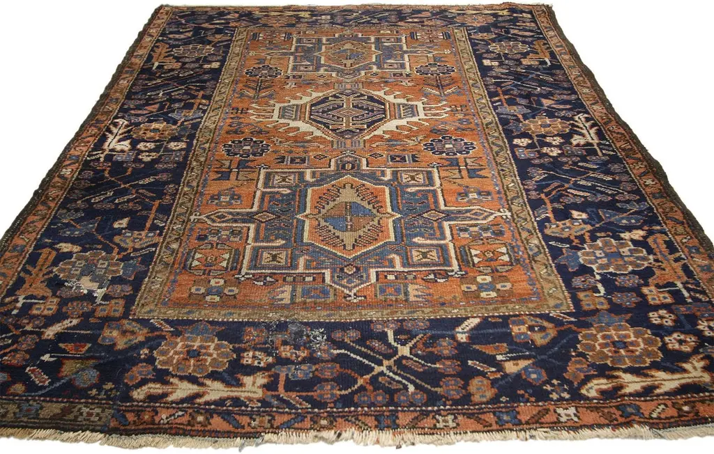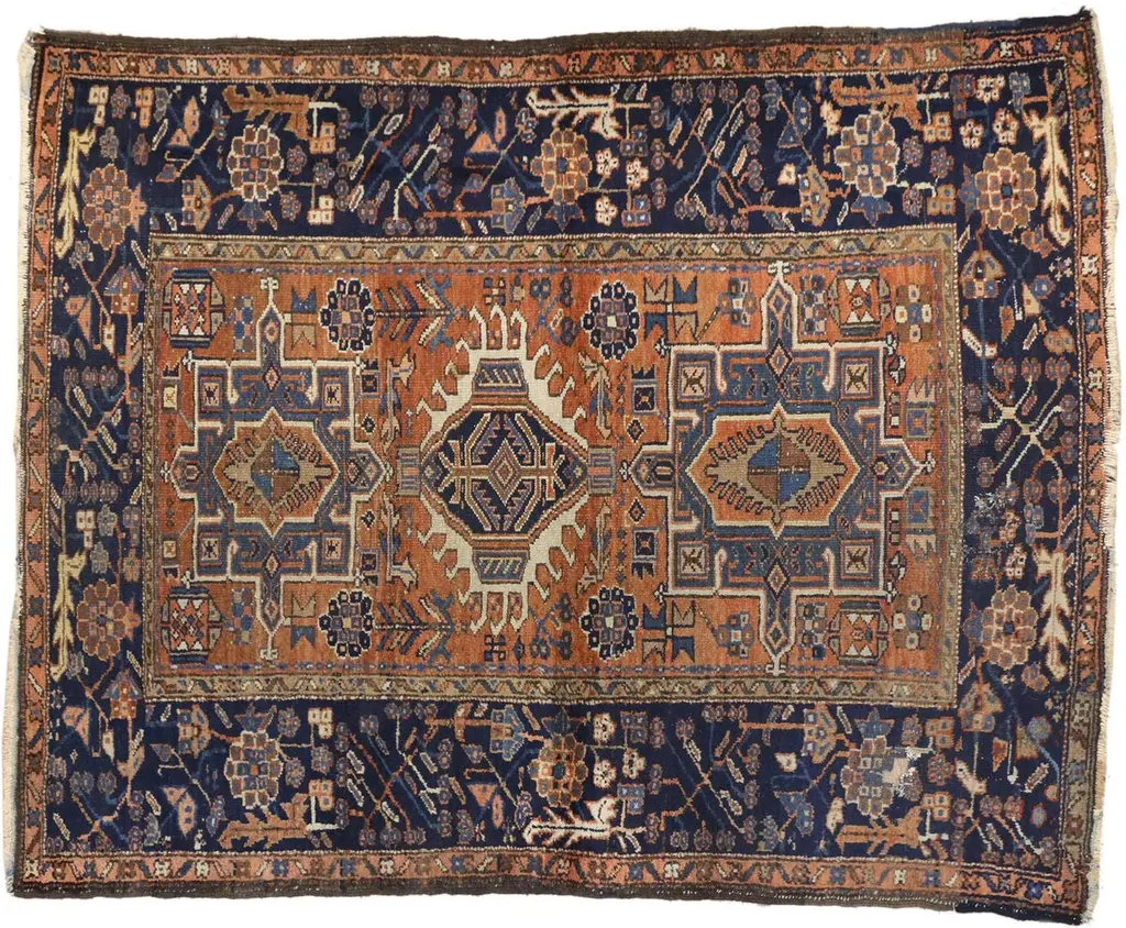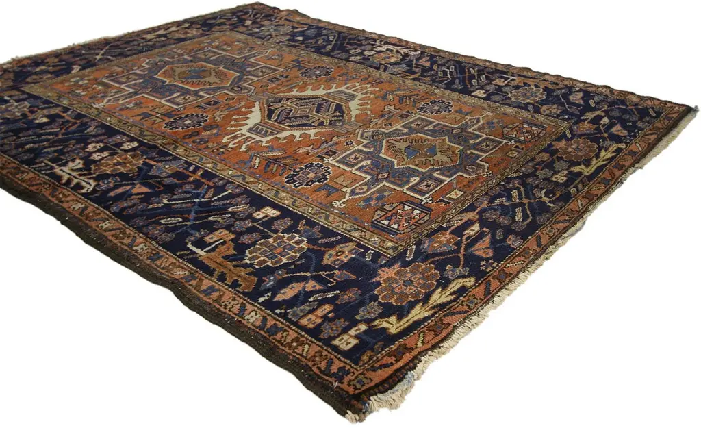 72988 Distressed Antique Persian Karaja Heriz Rug, 04'08 x 05'10. This hand-knotted wool distressed antique Persian Karaja Heriz rug with Mid-Century Modern style features a latch-hook amulet flanked by two square cruciform medallions surrounded by rosettes, stylized florals, serrated leaves, and rectilinear ambiguous tribal motifs. The all-over geometric pattern fills the abrashed and weathered terra cotta colored field. It is enclosed with a complementary angular botanical border flanked with an inner running water guard band and outer floral meander guard band. With its perfectly worn-in charm, pop of color and edgy elements, this weathered Persian Heriz rug will create a warm, lived-in look and takes on a curated look that feels timeless while creating an elegant design aesthetic. Rendered in variegated shades of terra cotta, burnt orange, rust, navy blue, royal blue, coffee, camel, tan, ecru, beige, and taupe with other accent colors.Distressed. Age Wear. A couple small holes. As-Is.Abrash. Weathered. Worn-In Look. Hand knotted wool.Made in Persia, Karaja Region (Iran).Measures: 04'08 x 05'10.Date: 1920's. Early 20th Century.