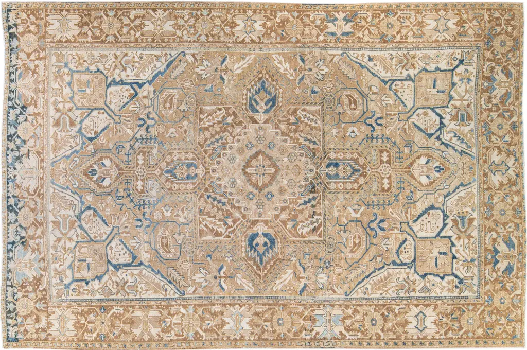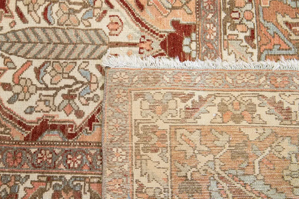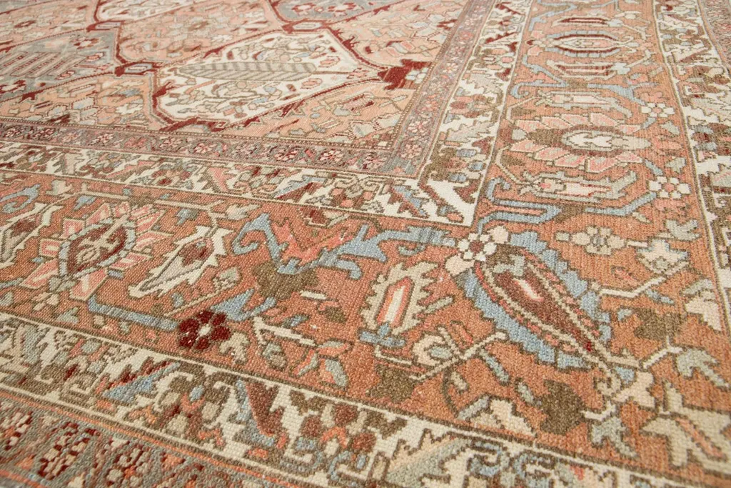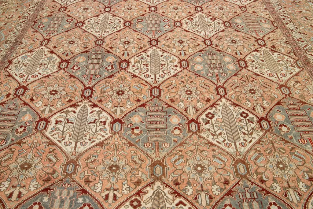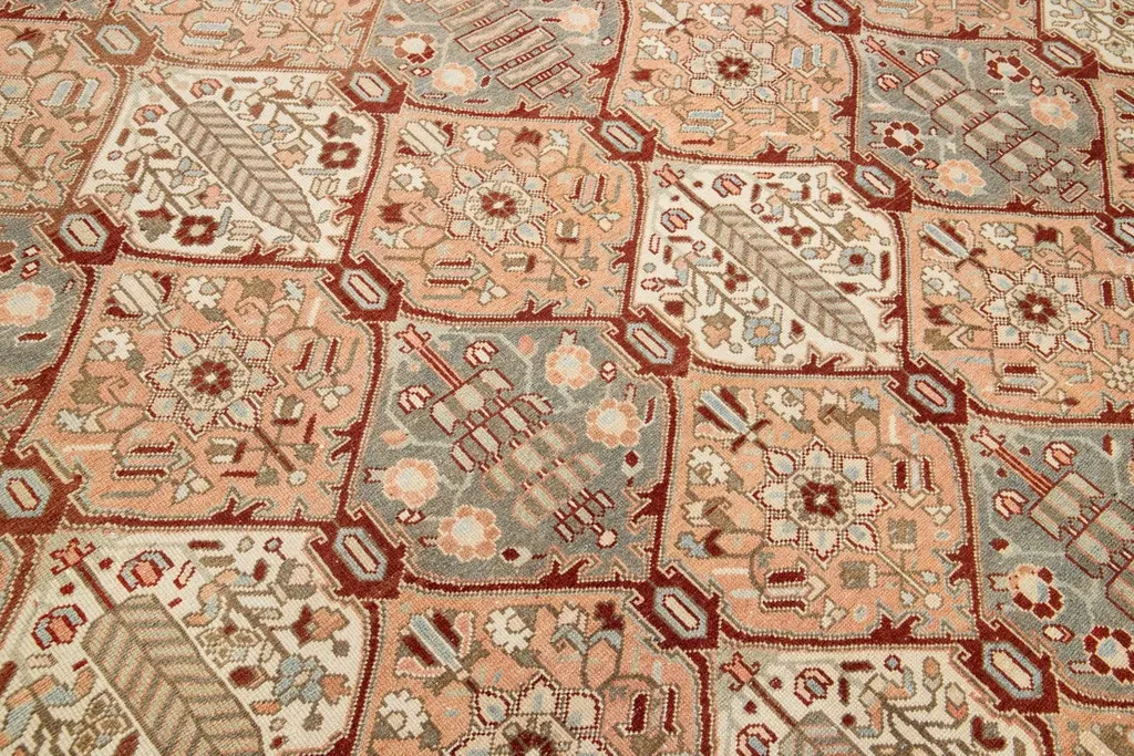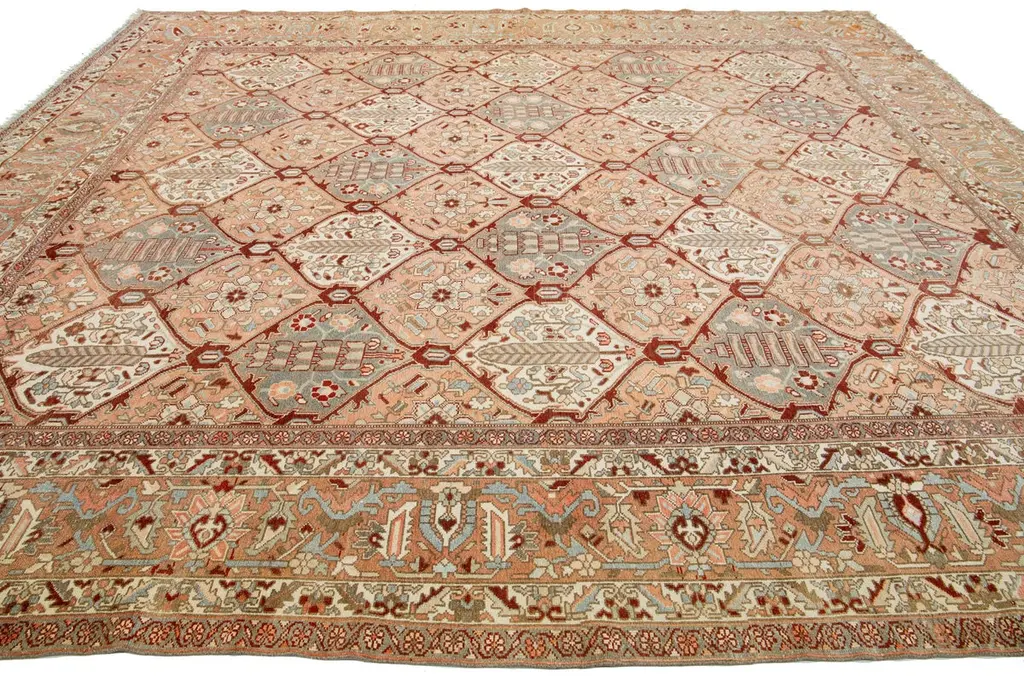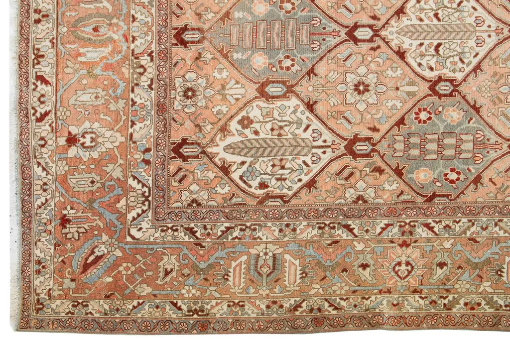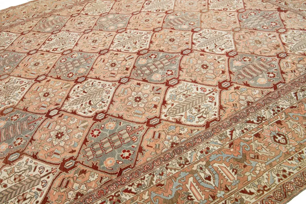 Beautiful Antique Bakhtiari hand-knotted wool rug featuring a peach-colored field. This exquisite Persian rug showcases a classic geometric floral design with blue, beige, red-rust, and gray hues.This rug measures 12'4" x 14'.