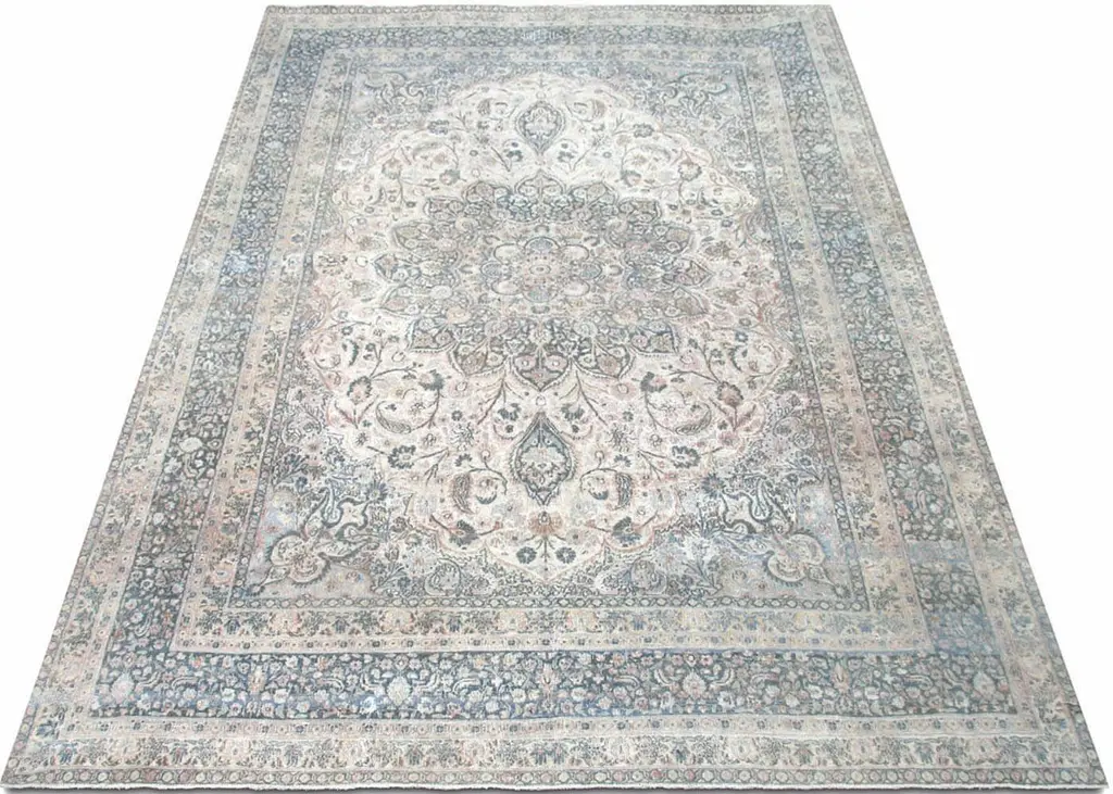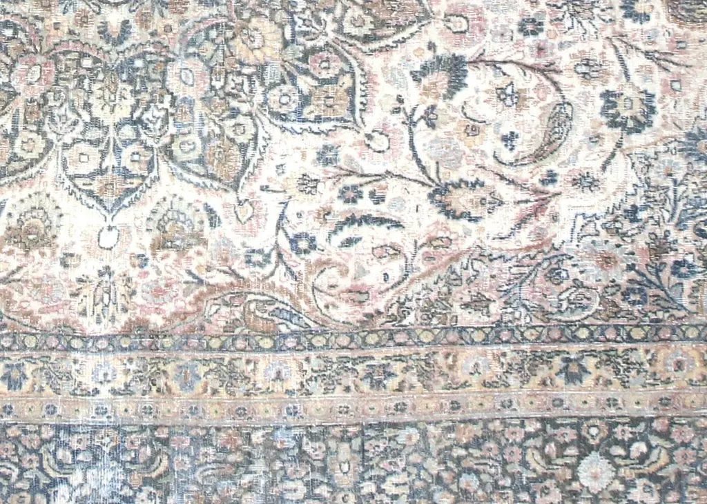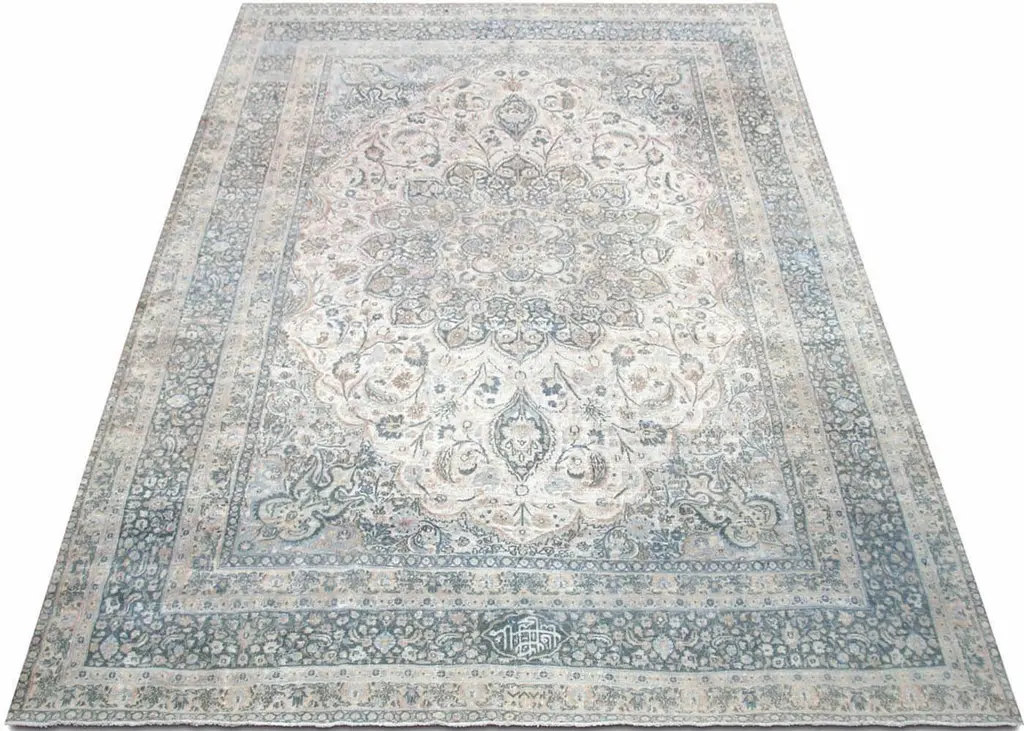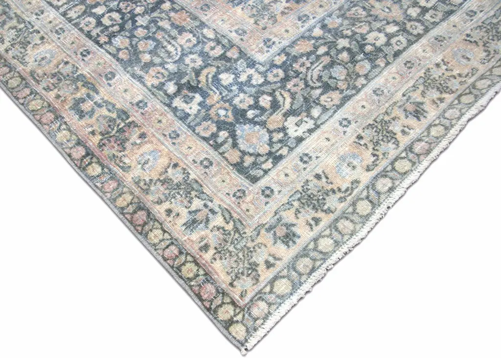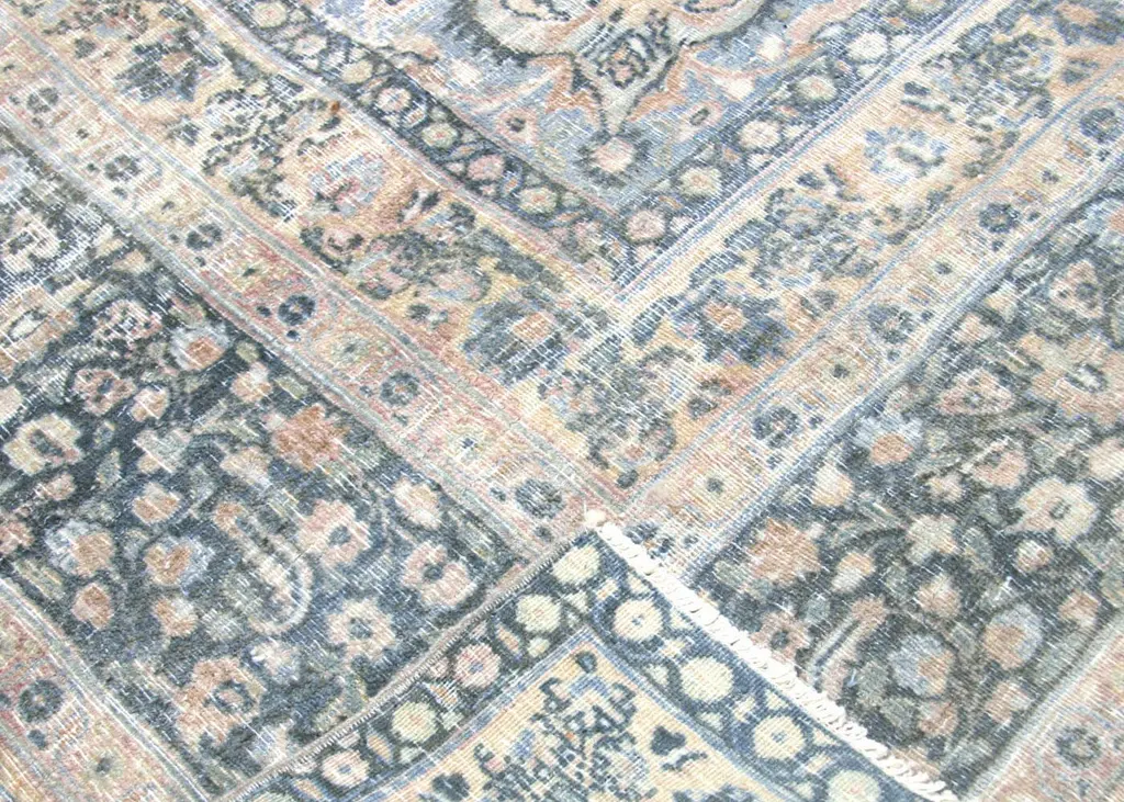 1930s Persian Meshed Rug. Hand woven in the Tabriz region of Northern Iran. Distressed and refinished in the U.S. The Persian carpet is a part of the Persian (Iranian) art and culture. Carpet-weaving in Persia dates back to the Bronze Age. The earliest surviving Persian carpets come from the Safavid dynasty in the 16th century.