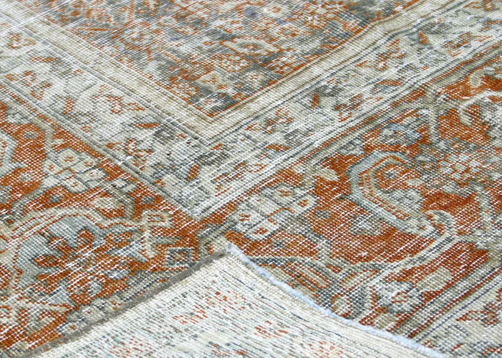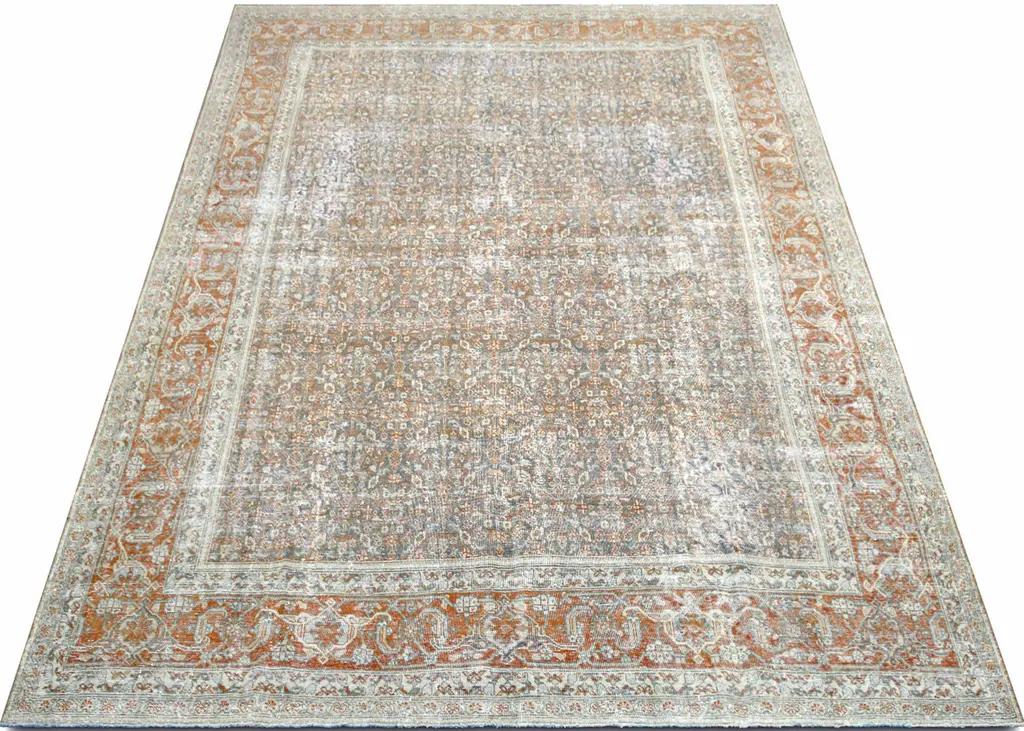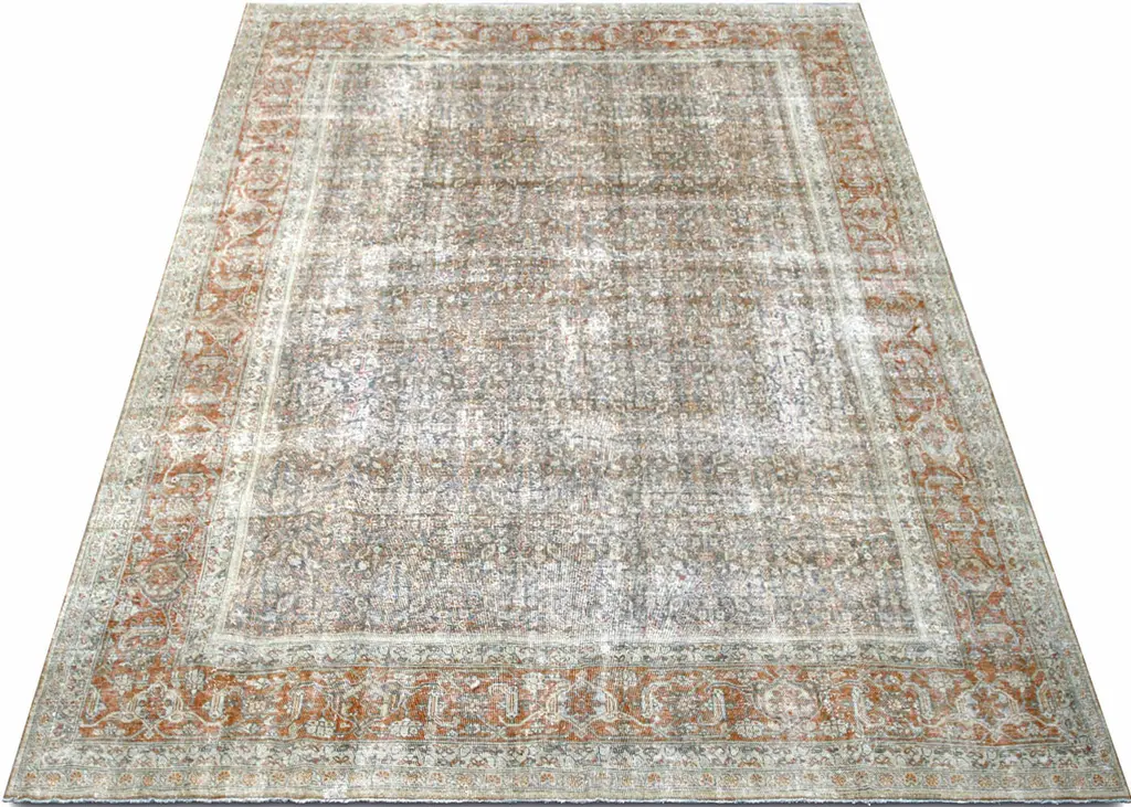 1940s Persian Tabriz Carpet. Hand woven in the Tabriz region of Northern Iran. Distressed and refinished in the U.S. The Persian carpet is a part of the Persian (Iranian) art and culture. Carpet-weaving in Persia dates back to the Bronze Age. The earliest surviving Persian carpets come from the Safavid dynasty in the 16th century