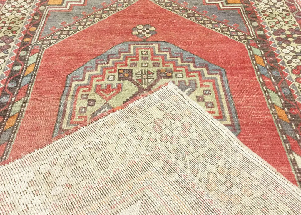 1960sTurkish Oushak Rug. Handwoven with wool on wool foundation in the Oushak region of Western Turkey. The Anatolian plateau is where the weaving of oriental carpets originated. Rich in tradition and pride, each of the villages of the area produced a certain design and colors that the neighbors rarely copied. These Antiques were largely illustrated in historical European painting. Their bold geometrical designs and soft colors made them favorites of interior designers.