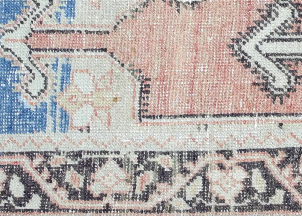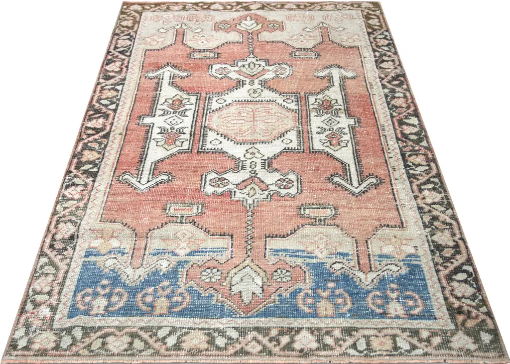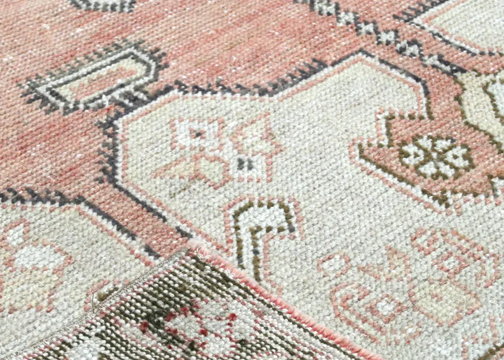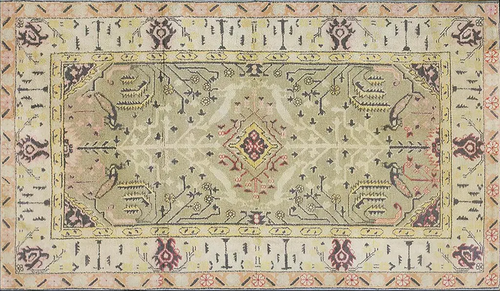 1960s Turkish Oushak Rug. Handwoven with wool on wool foundation in the Oushak region of Western Turkey.The Anatolian plateau is where the weaving of oriental carpets originated. Rich in tradition and pride, each of the villages of the area produced a certain design and colors that the neighbors rarely copied. These Antiques were largely illustrated in historical European painting. Their bold geometrical designs and soft colors made them favorites of interior designers. 210536