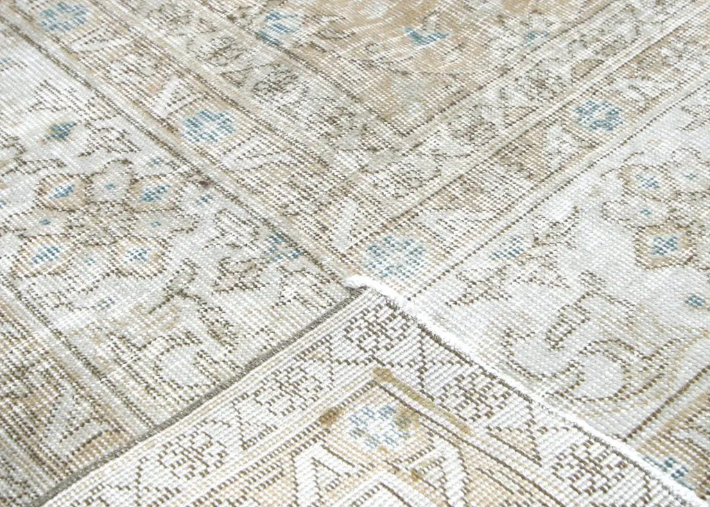 1960s Turkish Oushak Rug. Handwoven with wool on wool foundation in the Oushak region of Western Turkey. The Anatolian plateau is where the weaving of oriental carpets originated. Rich in tradition and pride, each of the villages of the area produced a certain design and colors that the neighbors rarely copied. These Antiques were largely illustrated in historical European painting. Their bold geometrical designs and soft colors made them favorites of interior designers.