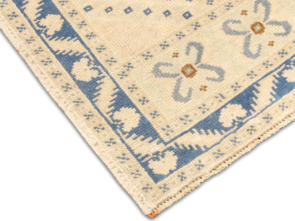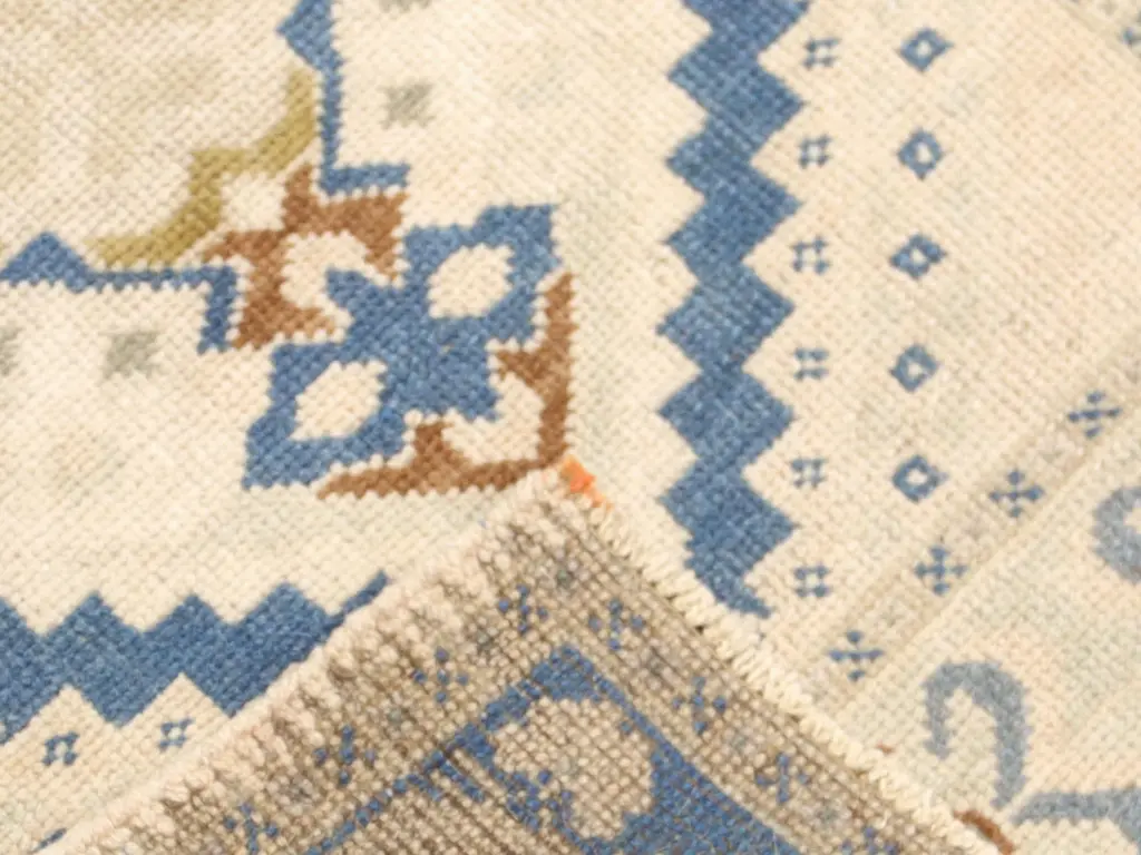 Vintage Turkish Oushak Rug - 1'10" x 3'8", A Turkish Oushak Yastic is a type of small rug that originated in the Oushak region of Turkey. These rugs are known for their soft colors, geometric patterns, and silky wool. They are often used as pillows, cushions, or wall hangings. Oushak Yastics are highly sought after by decorators as accent pieces for their unique charm and elegance.