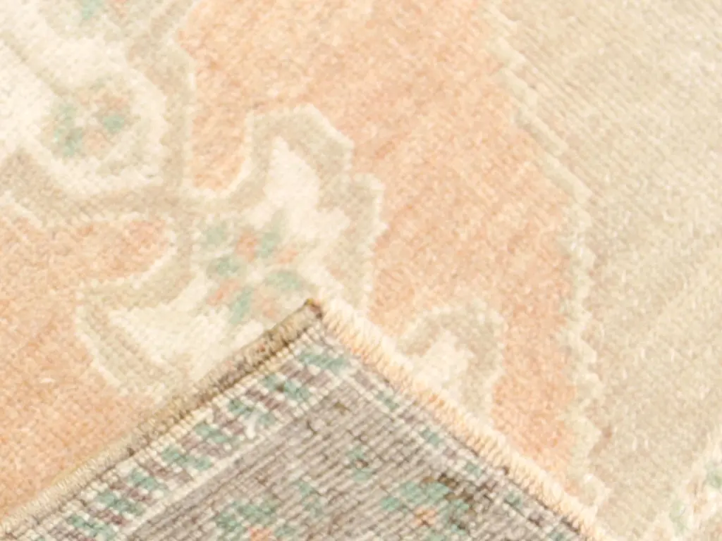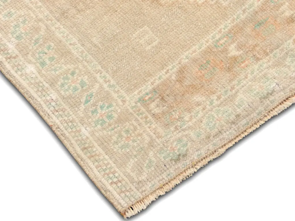 Vintage Turkish Oushak Rug - 1'9" x 3'5", A Turkish Oushak Yastic is a type of small rug that originated in the Oushak region of Turkey. These rugs are known for their soft colors, geometric patterns, and silky wool. They are often used as pillows, cushions, or wall hangings. Oushak Yastics are highly sought after by decorators as accent pieces for their unique charm and elegance.