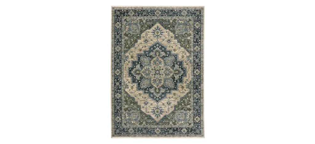 Enhance your living space with the 1'9"x3'2" Fiber Rug-Safaa Traditional Tile Indigo Rectangle. The beautiful blue and gold color combination adds a touch of timeless tradition to any room. Made from durable nylon and polypropylene, this rug is designed to withstand high-traffic areas in your home.