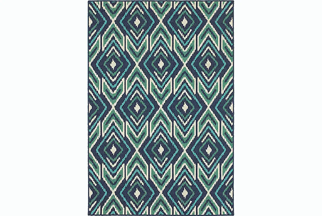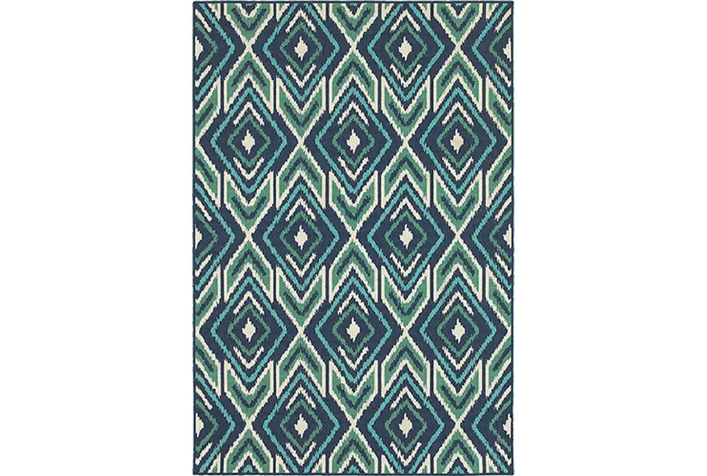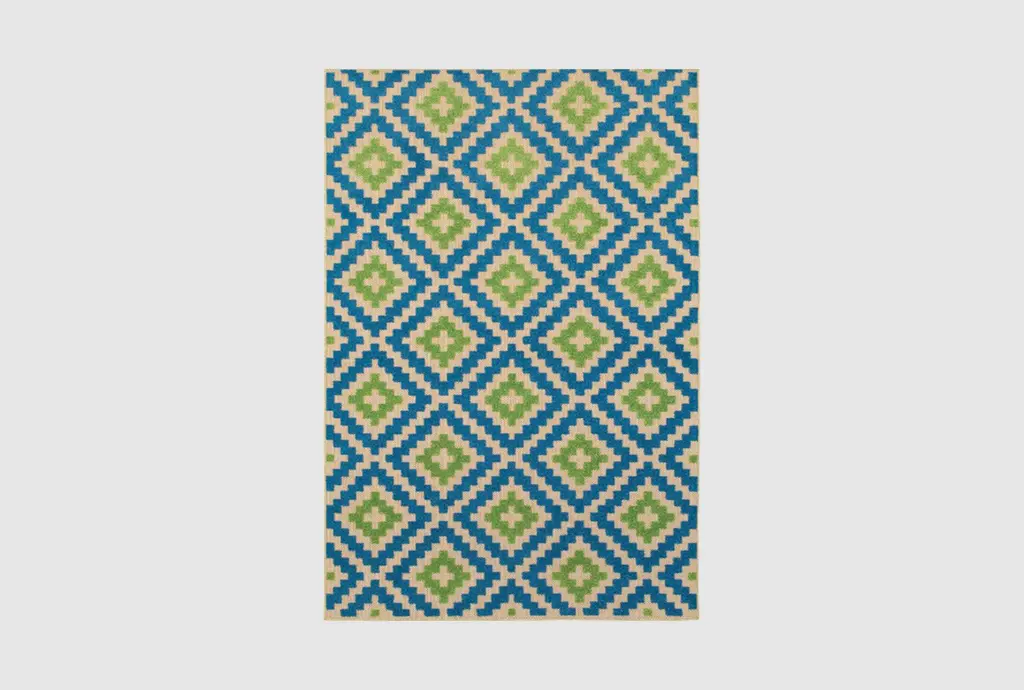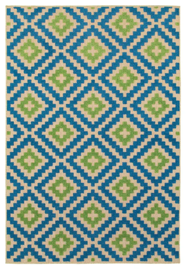 Enhance your indoor or outdoor space with the vibrant 1'9"x3'3" Fiber Outdoor Rug in Lime and Blue Birds Eye. The contemporary Aztec design in sand and blue adds a pop of color and a touch of boho-chic style to any area. Made from durable polypropylene, this rectangle rug is perfect for high-traffic areas.