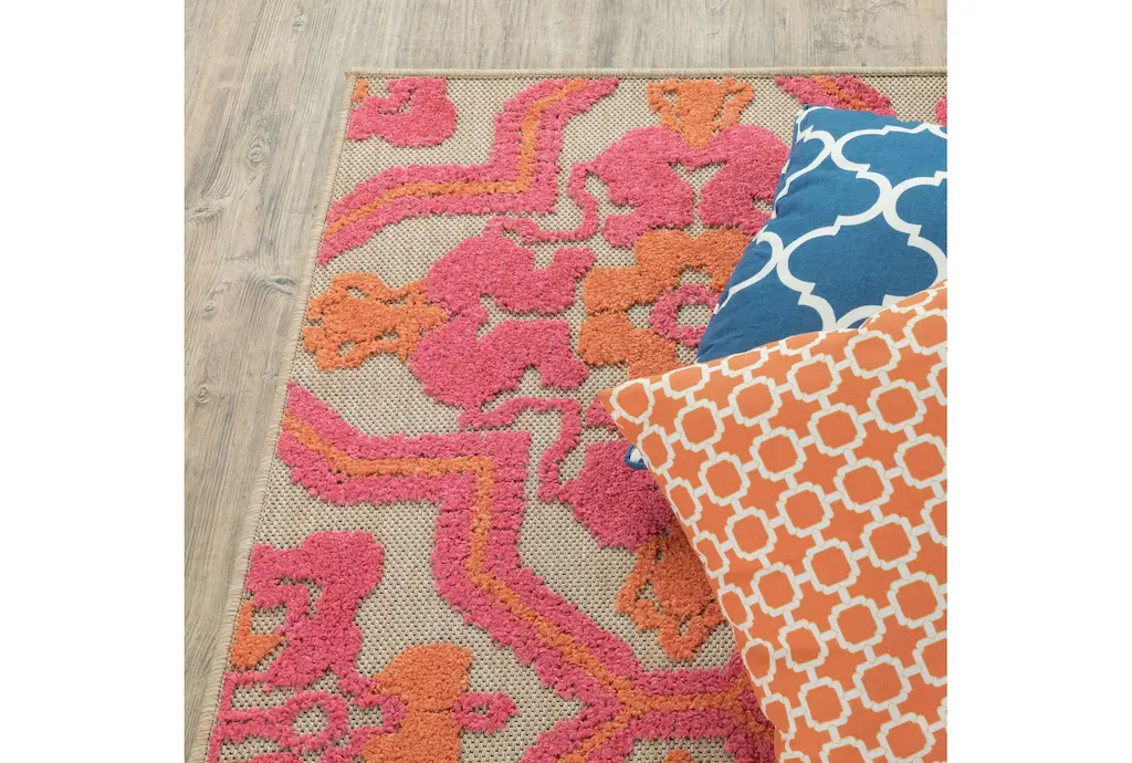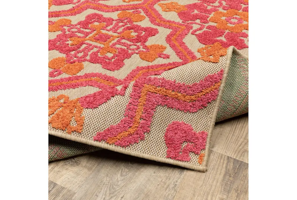 Bring vibrant color and a touch of traditional charm to your indoor or outdoor space with our 1'9"X3'3" Fiber Rug in Fuschia and Mandarin Aztec design. This rectangular rug features a beautiful blend of sand and pink shades, creating a stunning focal point that complements any decor. Made from durable polypropylene, this rug is perfect for high-traffic areas and outdoor settings.