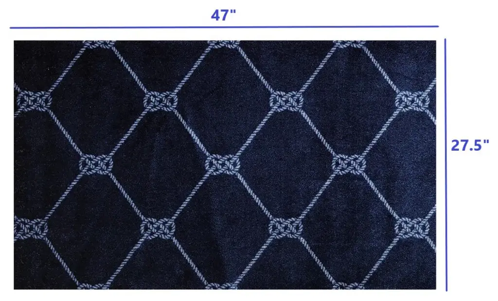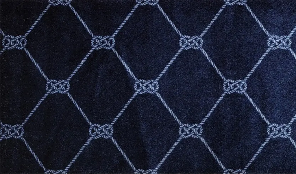 This low profile Navy Nautical Knots Washable Floor Mat is a game changer. A fade resistant slightly distressed nautical rope design in a deep indigo blue that is super sturdy and can easily be thrown into the washer and dryer to clean. The premier formula rubber backing used makes this nylon rug slip resistantr with no need for an additional pad, and the backing will hold up during the wash and dry! The low profile means it easily fits under doors. Combine fashion and style with real life functionality with this great area rug/door mat. 27.5" x 47" x .3"