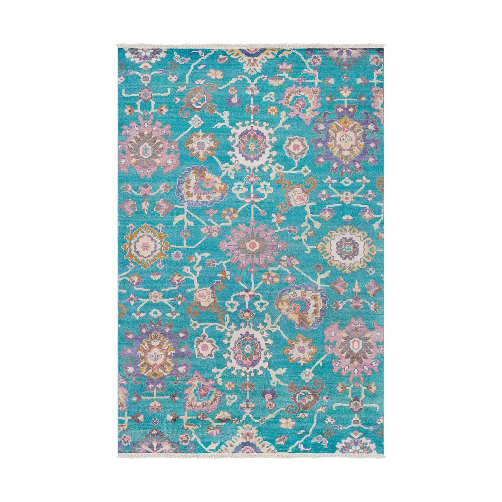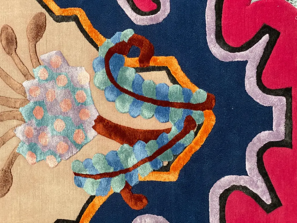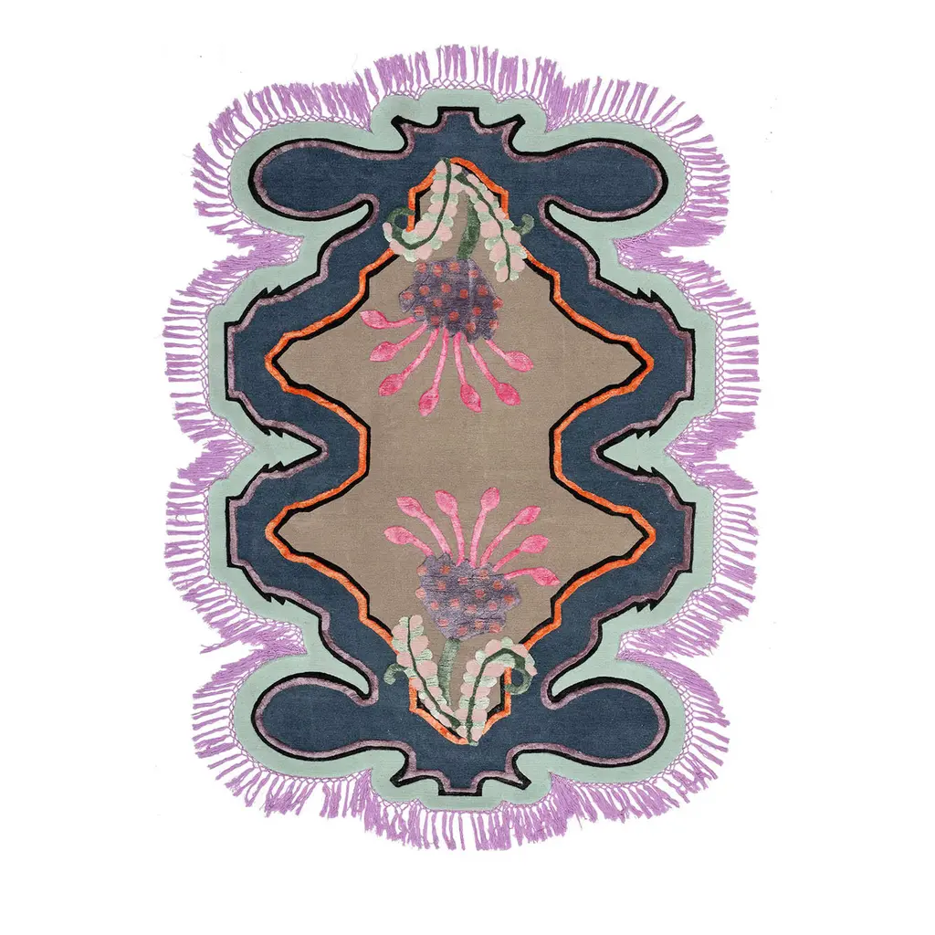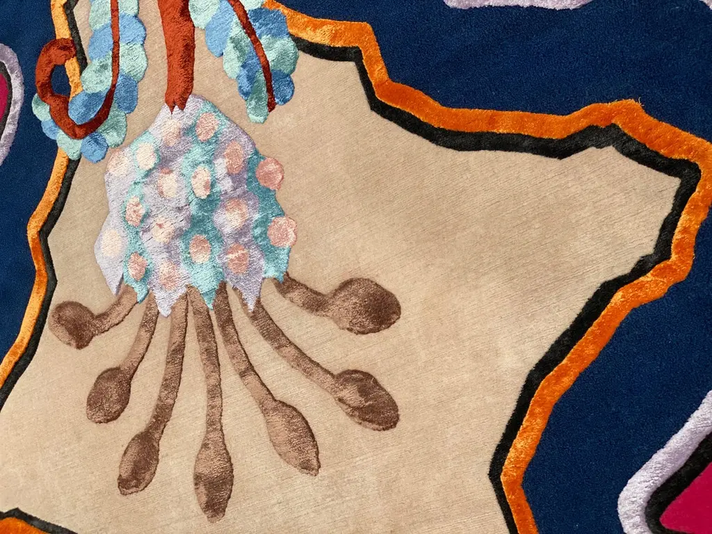 It’s a playful hand-knotted rug made with Himalayan wool and natural silk, inspired by flora and organic shapes with vibrant colors and stylistic geometries that reflect artist’s eclectic vision and her personal take on interior design.This rug is hand knotted in Nepal by our artisans by using 50% silk and 50% fine Himalayan wool dyed using vegetable and mineral pigments. The base is 5 mm high, while the design is 7 mm high with 152,000 knot/sqm.Customizable in terms of size, colors, fiber compositions, shape and pile heights. Anti-stain treatment available upon request.
