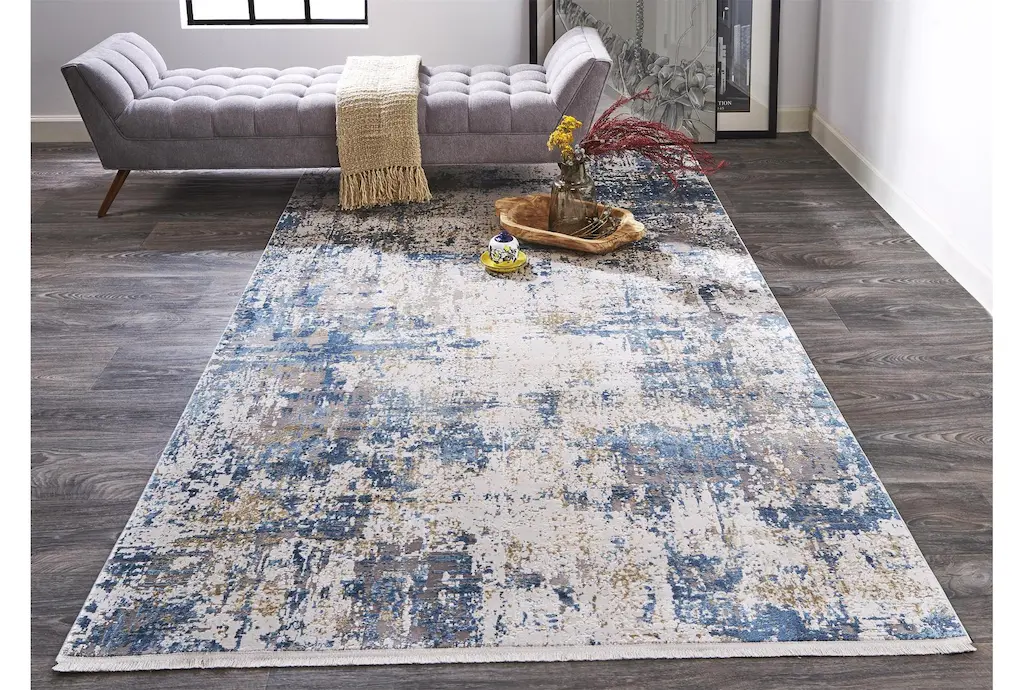 Enhance your living space with the 2'2"x3'2" Fiber Rug in Cameron Blue/Ivory. This casual and contemporary rug features an abstract design that adds a touch of style to any room. Its low pile ensures easy maintenance and a comfortable feel underfoot.