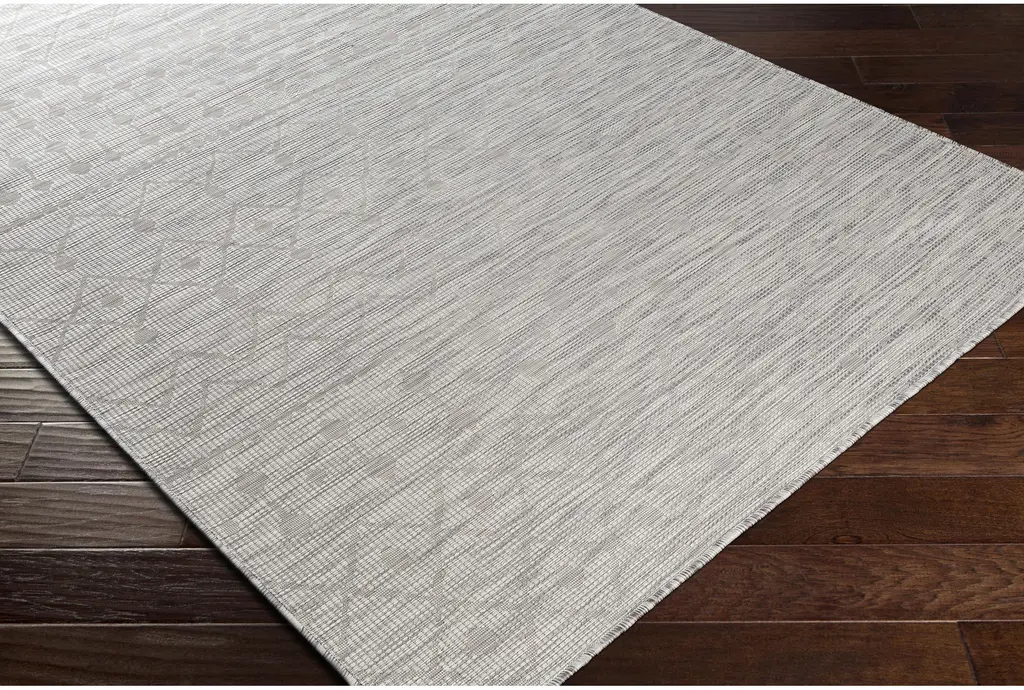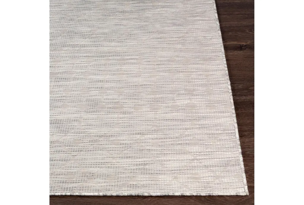 This versatile 2'5" x 4' indoor/outdoor fiber rug in beige and cream mottled design is perfect for high traffic areas. Its geometric pattern and neutral tones make it a stylish addition to any space, while its UV resistance ensures durability both indoors and outdoors.
