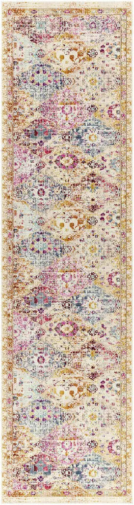 Enhance your living space with the 2'6"x10'3" Fiber Rug-Traditional Bold Multicolor by Surya. This long, low pile rug features a vibrant lattice design in a stunning array of saffron, burnt orange, dark blue, garnet, teal, charcoal, and beige. Perfect for hallways, kitchens, and indoor areas, this traditional style rug adds a touch of color and warmth to any room.