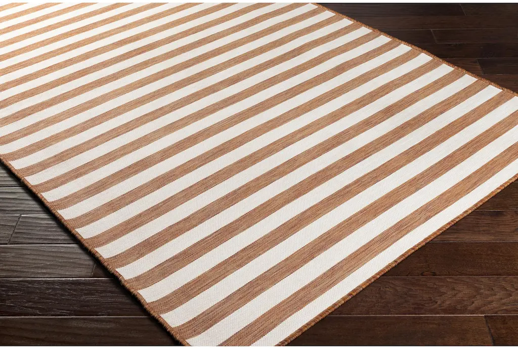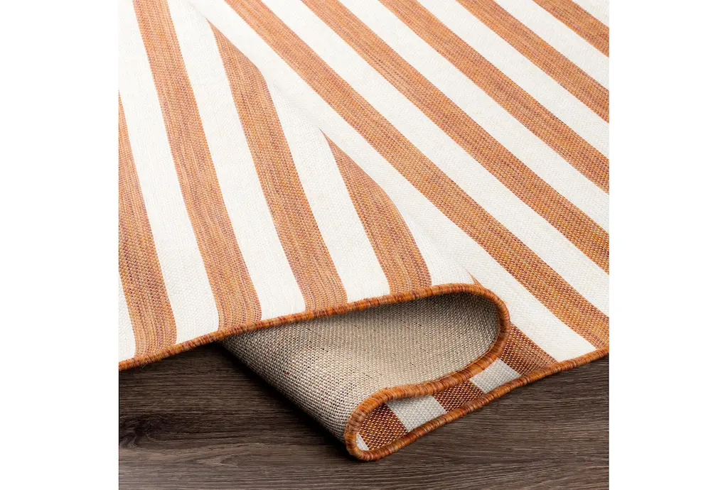 Enhance your living space with the 2'6"X5' Fiber Indoor/Outdoor Rug in burnt orange and cream thin stripes. Designed to withstand high-traffic areas, this versatile rug is perfect for both indoor and outdoor use. Its low pile makes it easy to clean and maintain, while the UV-resistant material ensures lasting color and durability.