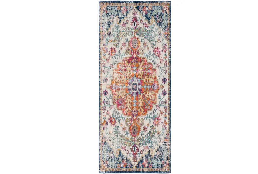 The Ivete Medallion Traditional Fiber Rug in fuschia and orange by Surya adds a vibrant touch to your hallway or indoor space. Its striking medallion and floral motif bring a bold, boho-chic aesthetic to any interior. The low pile design ensures easy maintenance and lasting durability.