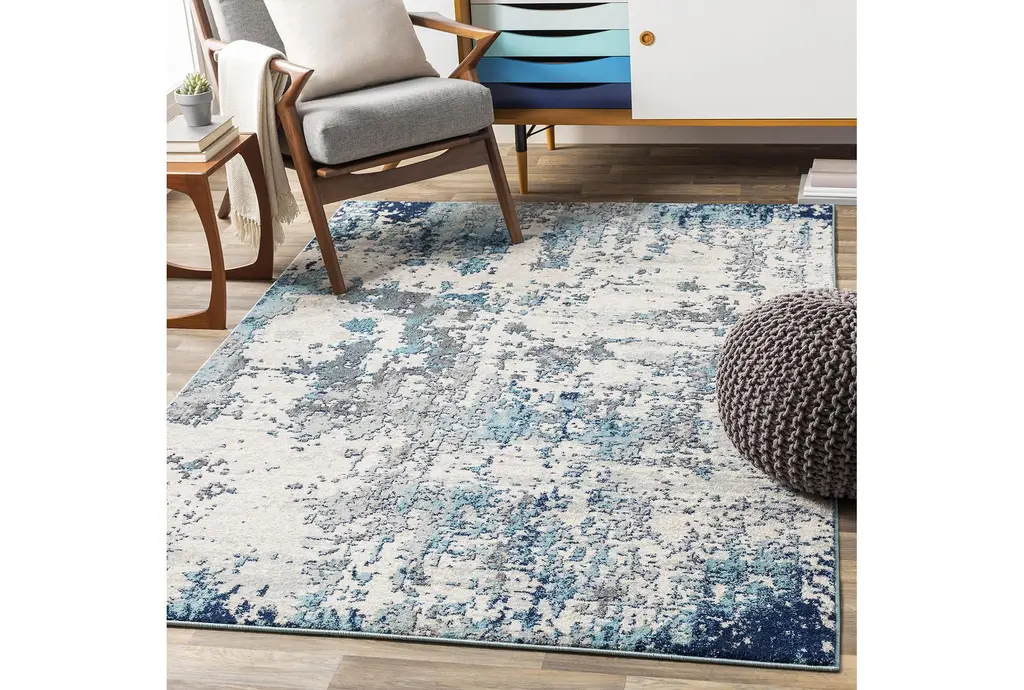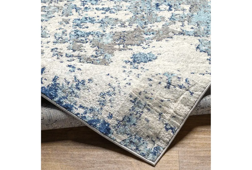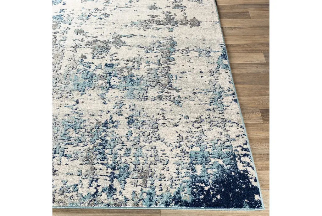 Enhance your hallway with the 2'6"x7'3" Fiber Rug by Surya. This modern rectangular rug features an abstract design in navy, aqua, light grey, white, and medium grey colors. The low pile height makes it a durable choice for high-traffic areas.