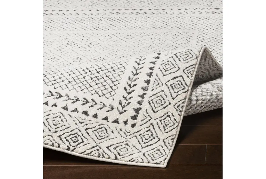 Enhance your indoor space with the 2'6"x7'3" Fiber Rug by Surya. This modern geometric rectangle rug features a grey and beige color scheme that complements any room. Its low pile design adds a soft touch to high-traffic areas, making it both practical and stylish.