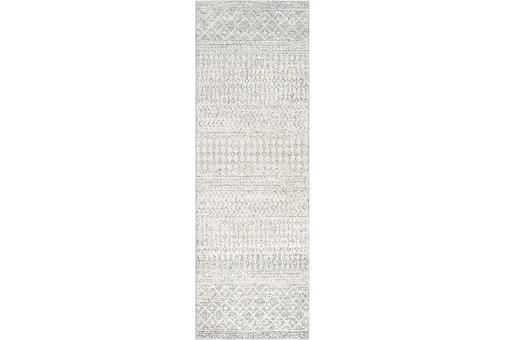 Enhance your indoor space with the 2'6"x7'3" Fiber Rug by Surya. This modern geometric rectangle rug features a grey and beige color scheme that complements any room. Its low pile design adds a soft touch to high-traffic areas, making it both practical and stylish.