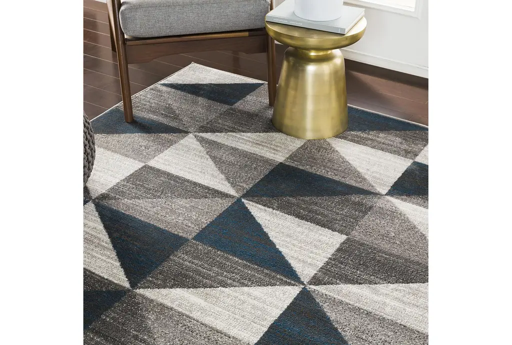 Enhance your hallway or indoor space with the 2'6"x7'3" Fiber Rug by Surya. This modern geometric rug features a striking pattern of triangles in light grey, white, charcoal, and sky blue. The low pile design ensures easy maintenance and a sleek look.