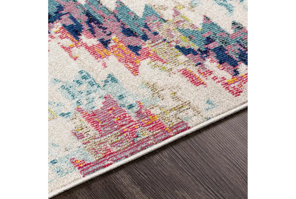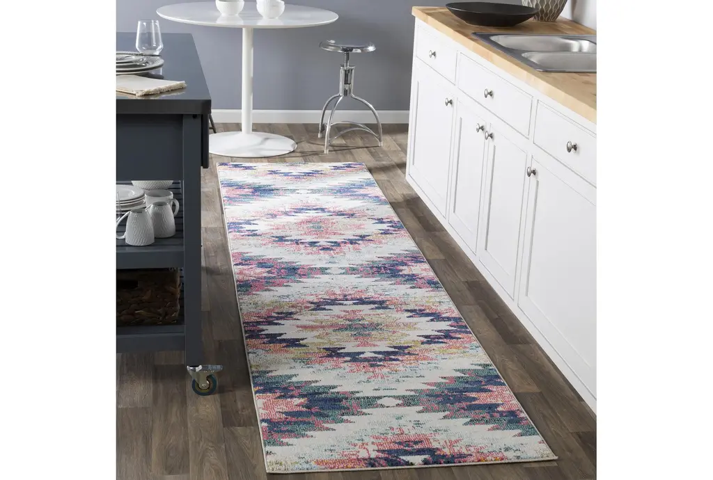 Enhance your indoor space with this stunning 2'6" x 7'3" fiber rug featuring a modern white and blue geometric pattern. Designed in a rectangle shape, this low pile rug combines both style and comfort, making it perfect for any room in your home.