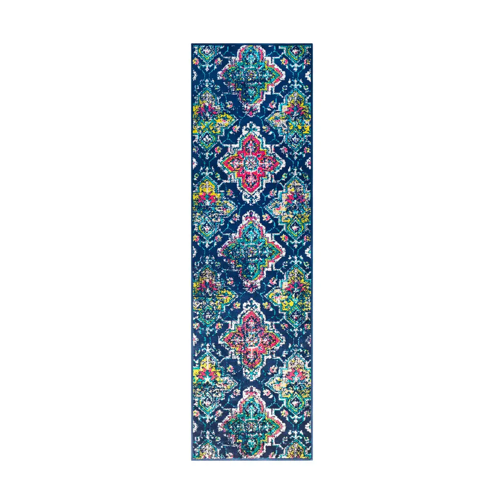 Enhance your hallway with the vibrant colors and traditional charm of the 2'6"x7'5" Fiber Rug by Surya. This low pile, abstract rectangle rug features a brilliant medley of bright pink, saffron, dark blue, aqua, medium grey, bright orange, light grey, and white. Made with 100% polypropylene, it's perfect for indoor settings.