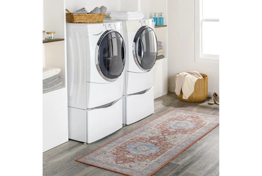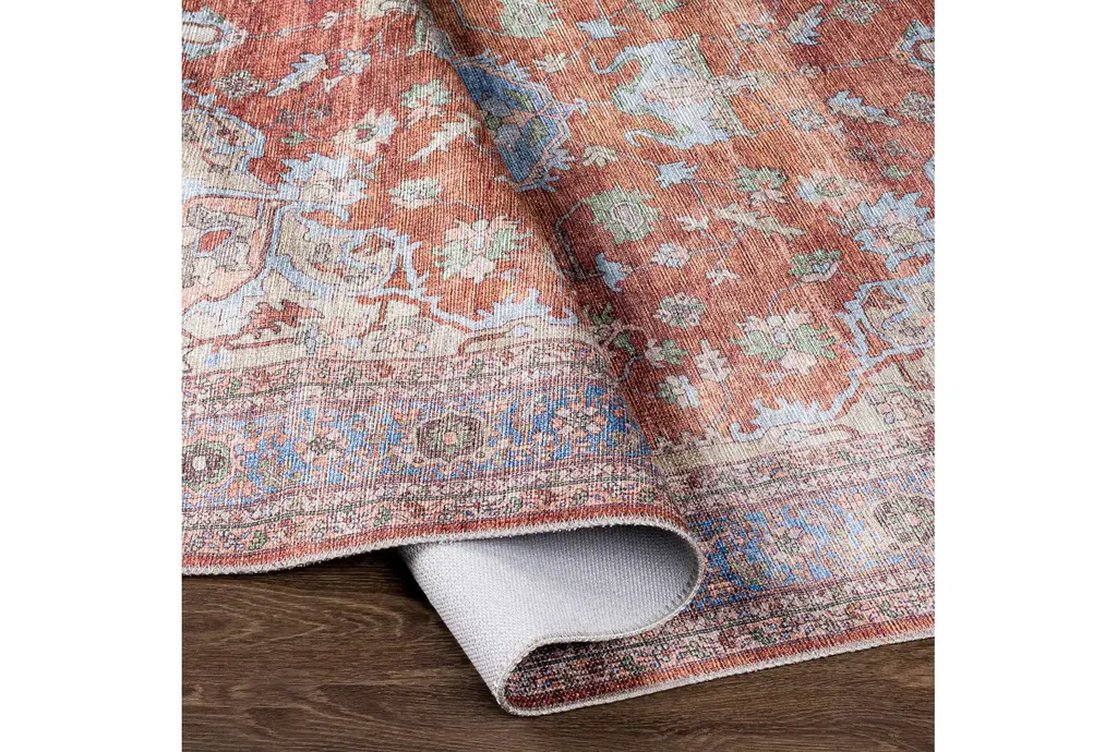 Enhance your home with the 2'7"x7'3" Runner Rug-Aleah Traditional Fabric Machine Washable Brown/Blue. This traditional rug features a blend of dark brown, denim, dark blue, grass green, and tan colors, making it a versatile addition to any room. Its rectangle shape and 100% polyester fabric ensure durability and easy maintenance.
