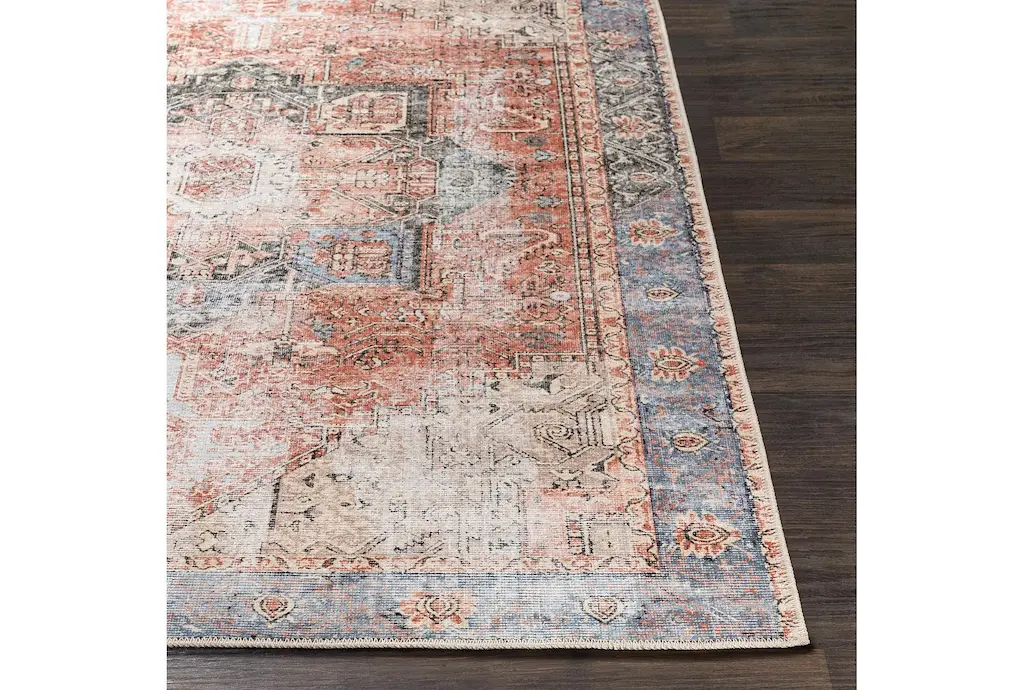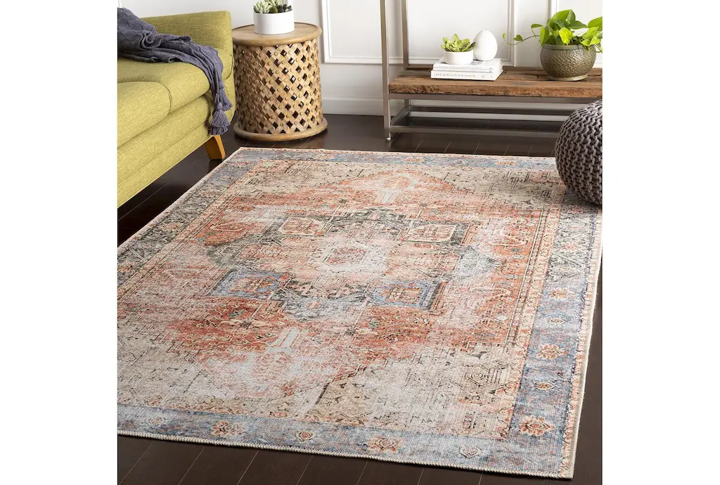Add a touch of traditional charm to your home with the 2'x2'9" Rug by Surya. This rectangle-shaped rug features a distressed abstract design in a multicolor palette of rose, denim, butter, beige, dark green, olive, and clay. The low pile and machine washable fiber make it a practical and stylish choice for any indoor space, including bathrooms.