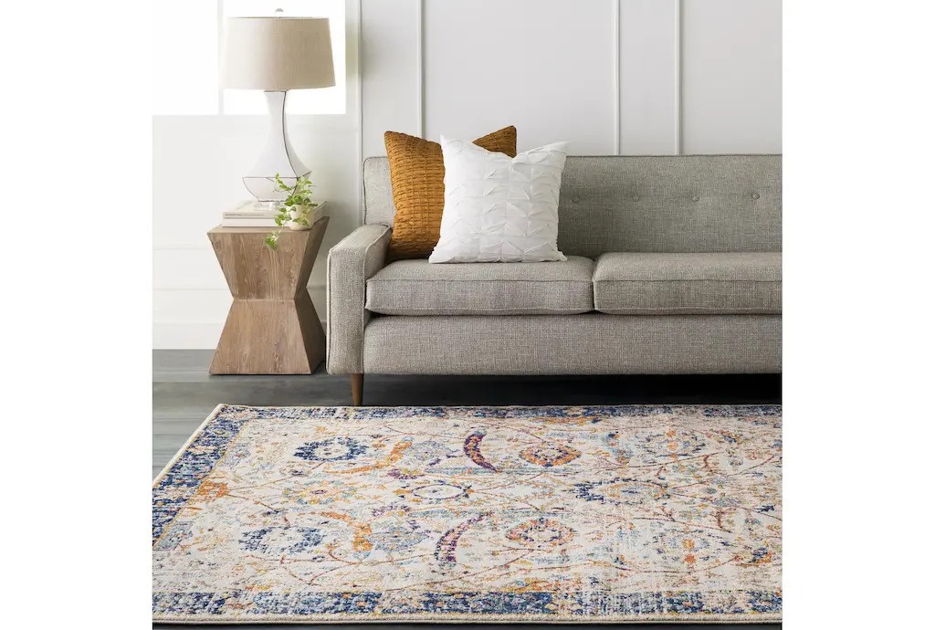 Introducing the 2'x3' Fiber Rug-Katari Traditional Dark Blue/Orange by Surya. This traditional rug features a stunning botanical design in rich hues of ivory, navy, burnt orange, aqua, and yellow. Crafted from 100% polypropylene, it is both durable and easy to maintain, making it a perfect addition to any entryway, living room, or indoor space.