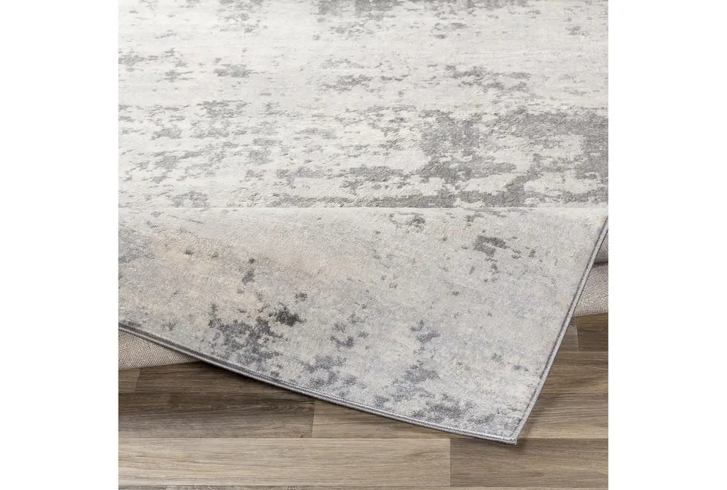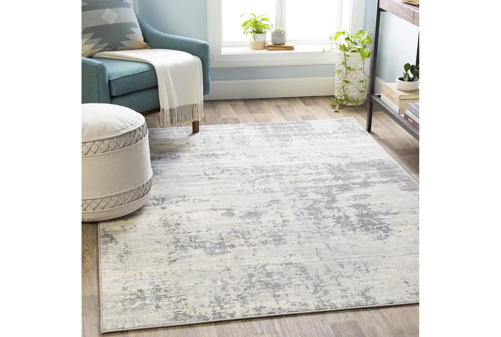 Enhance your living space with the 2'x3' Fiber Rug in modern grey and cream. This low pile, abstract rectangle rug by Surya is perfect for adding a touch of contemporary style to any room. The soft color palette of silver grey, medium grey, and cream creates a neutral yet sophisticated look.