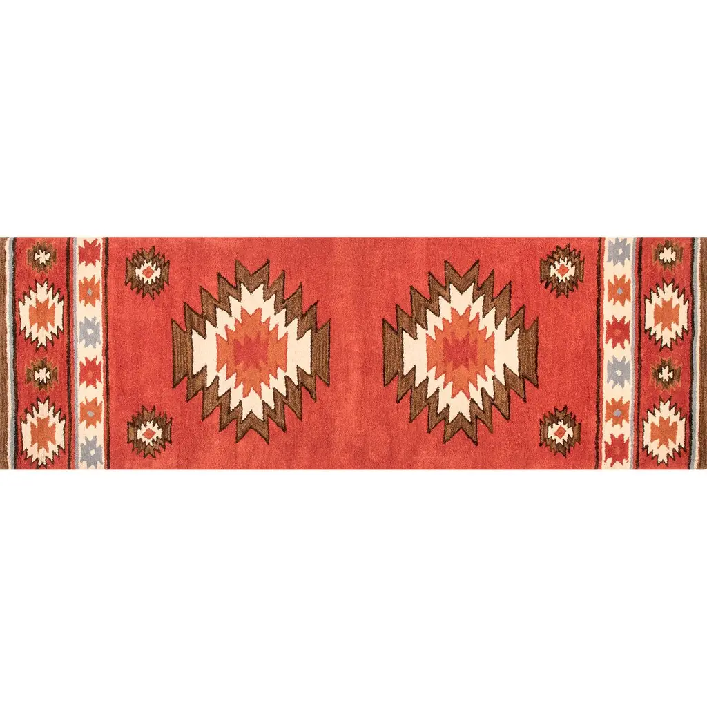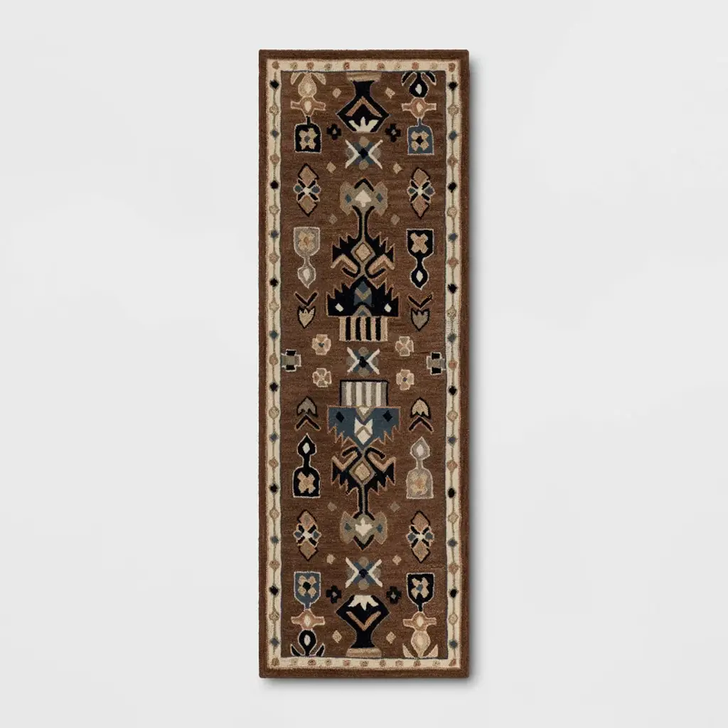 Add comfort and style to any space with this Global Wool Accent Rug from Threshold™. Showcasing a global pattern and framed by a border in blue for an eye-catching look, this rectangular accent rug features a hooked wool construction for a soft feel underfoot. Easy to clean, this medium-pile accent rug makes a perfect pick for a variety of rooms.Threshold™: Looks like home, feels like you.