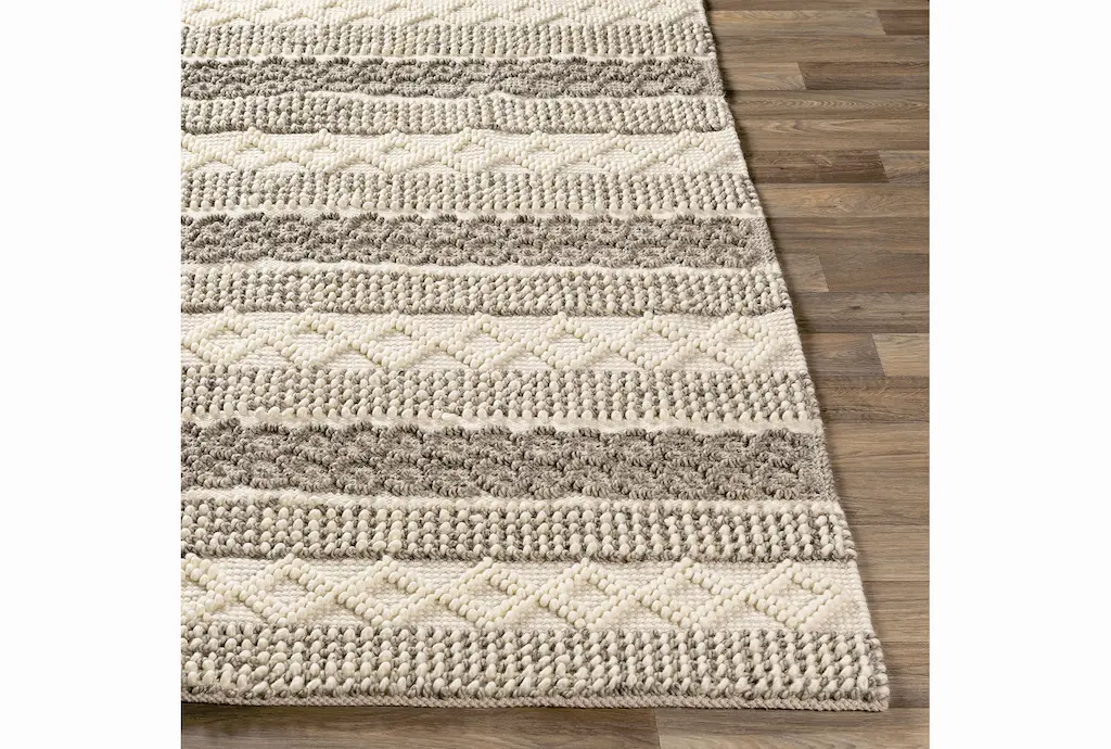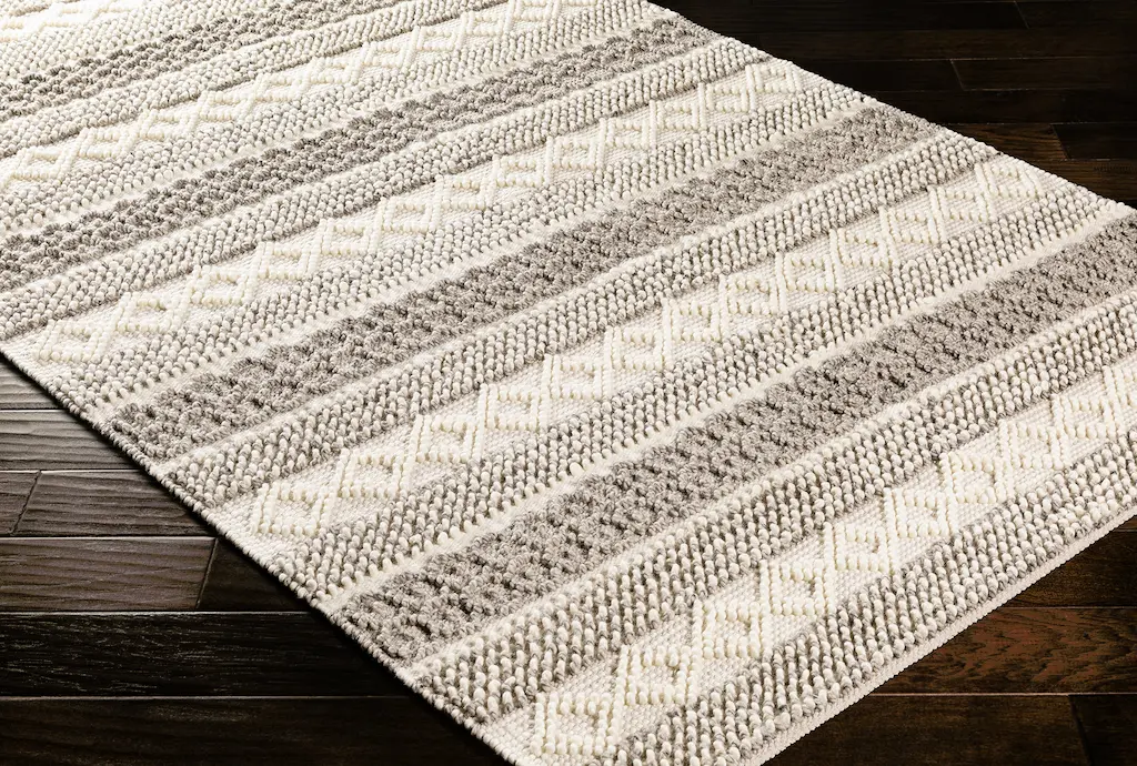 The 2'x3' Rectangle Rug by Surya combines textural handwoven craftsmanship with a modern grey and ivory stripe pattern. This farmhouse-style rug is designed to bring a touch of rustic charm to any bathroom, kitchen, or indoor space. Made from a blend of 60% wool and 40% cotton, its low pile ensures durability and comfort underfoot.
