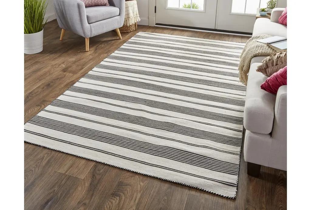 This 2'x3' Rug-Recycled Pet Fiber Black Pin Stripes is perfect for adding a touch of contemporary style to any space. Made from recycled polyester fibers, this durable rug is ideal for high-traffic areas in your home. The low pile height makes it easy to clean and maintain.