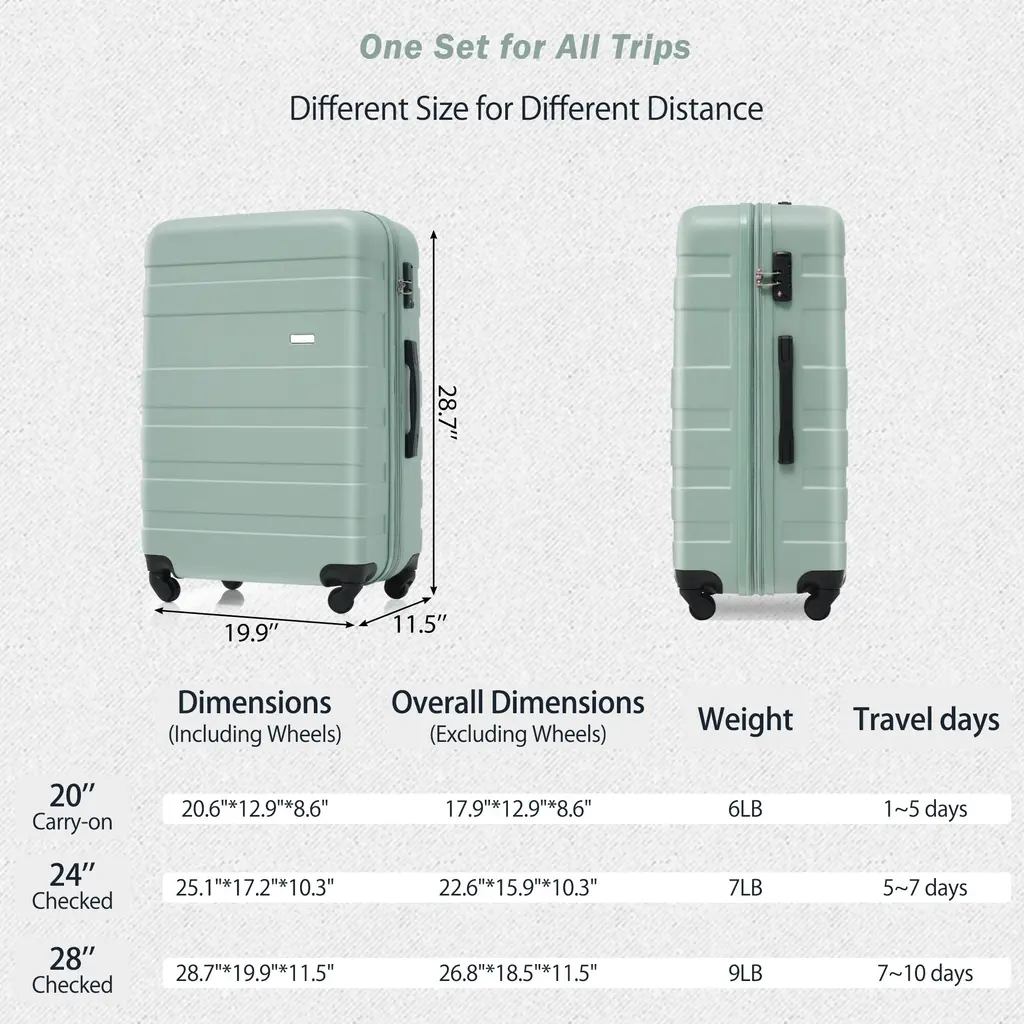 3 Piece Hardside Rugged Travel Luggage Set, Carry On Lightweight Durable Suitcase With Collision-Protection Angle And Tsa Lock - Green