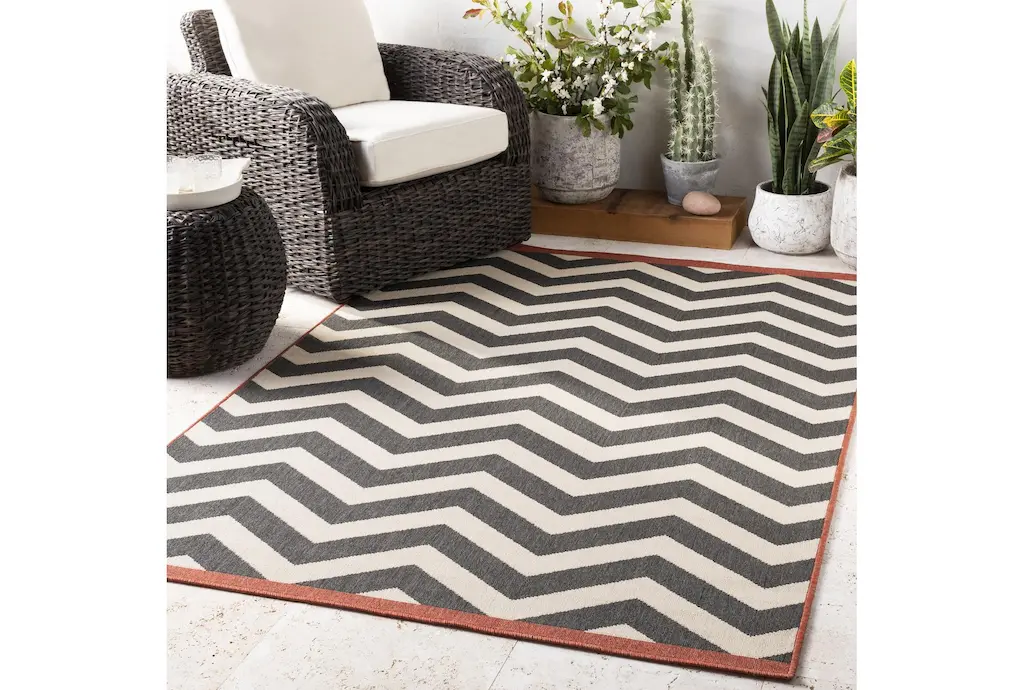 Add a touch of contemporary style to your home with the Tendu Chevron Black Rug by Surya. This low pile, rectangular rug features a striking black and beige chevron pattern, making it a perfect accent piece for any indoor space. Made of 100% polypropylene, it is durable and easy to maintain.