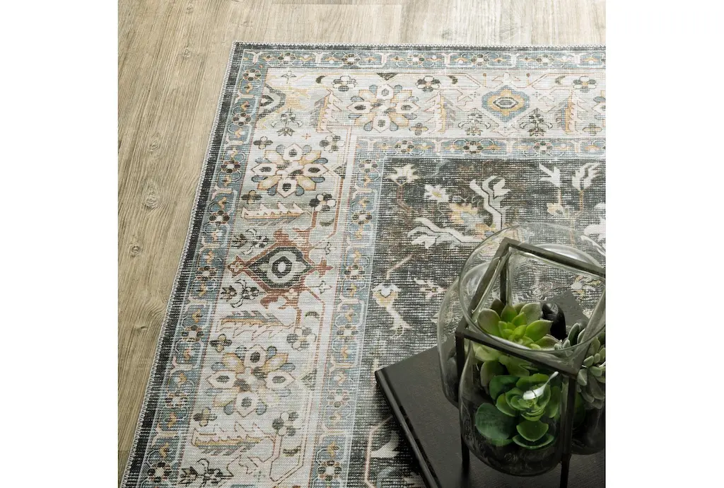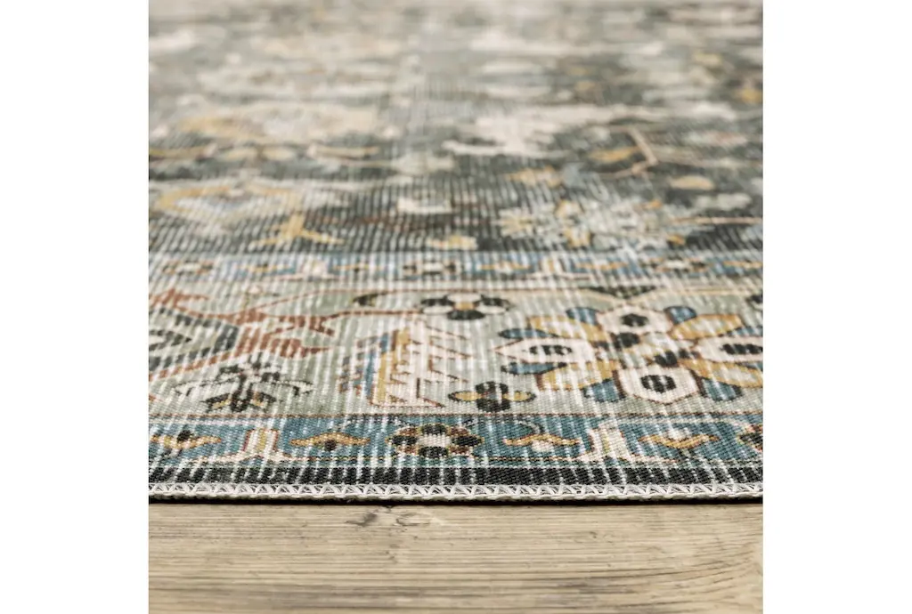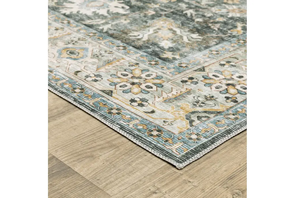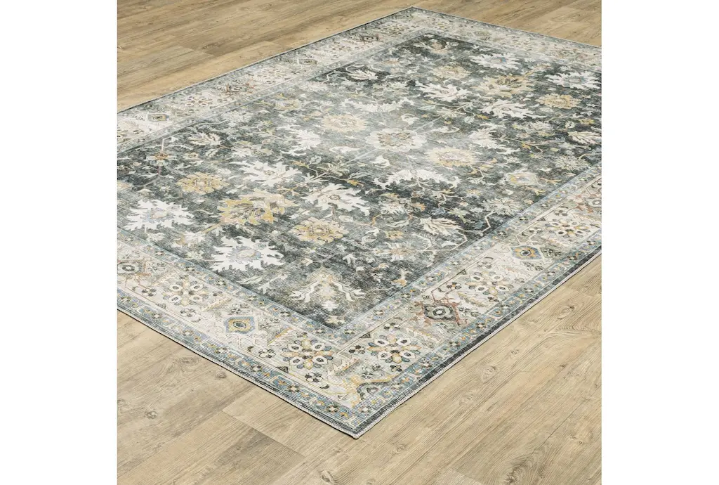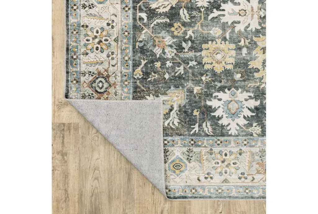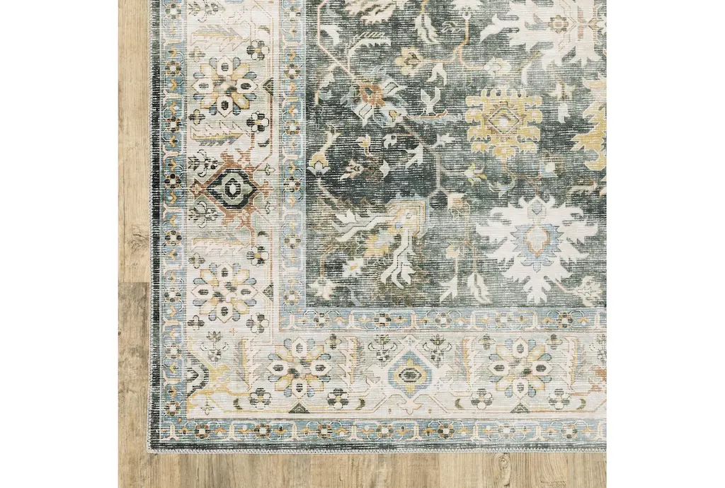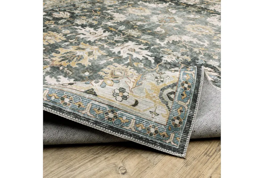 Enhance your indoor spaces with the Shem Creek Machine Washable Traditional Olive Rug. This versatile 3'6" x 6'6" rectangle rug features a beautiful botanical pattern in charcoal and gold, perfect for adding a touch of nature to your home. Designed for performance, this rug is both UV resistant and stain resistant, making it ideal for high-traffic areas.