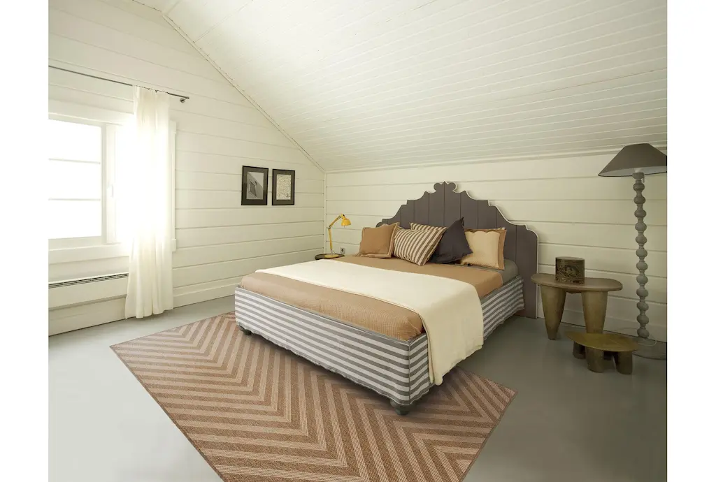 Enhance your living space with the versatile 3'7"X5'6" Indoor/Outdoor Kaida Chevron Print Rug. Its low pile makes it ideal for both high-traffic indoor areas and outdoor settings. The geometric chevron design in tan adds a touch of casual style to any room.