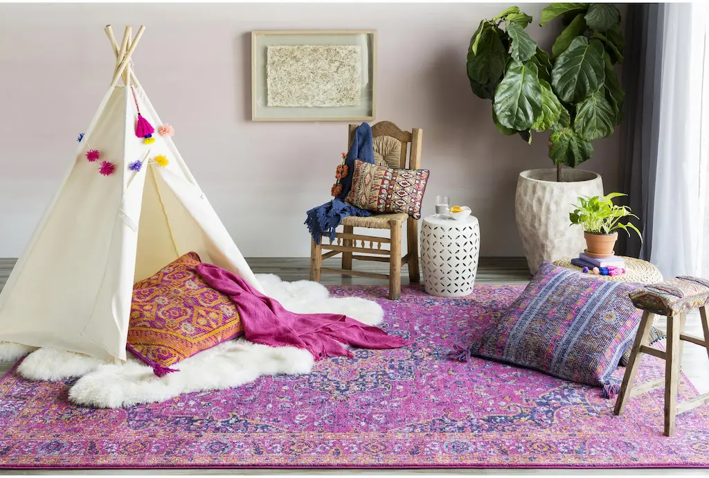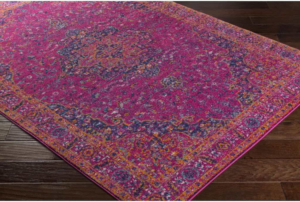 Add a touch of tradition and vibrant color to your home with the 3'9"x5'6" Fiber Rug-Ivete Medallion Traditional Fuschia/Orange by Surya. This stunning rectangle rug features a beautiful medallion and floral motif that is sure to catch the eye. The combination of garnet, burnt orange, teal, dark blue, and light grey colors creates a vivid and dynamic look.