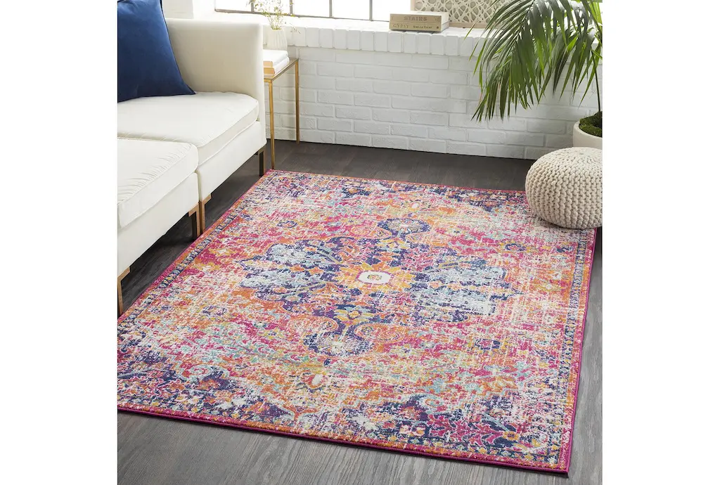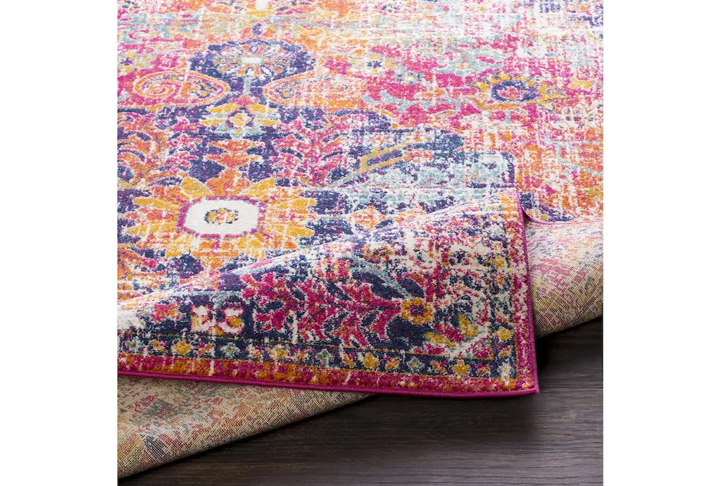 Enhance your interior space with the 3'9"x5'6" Fiber Rug in traditional bright pink and multicolor tones. This eye-catching floral design adds vibrant energy to any room. Made with 100% polypropylene, it offers durability and easy maintenance.