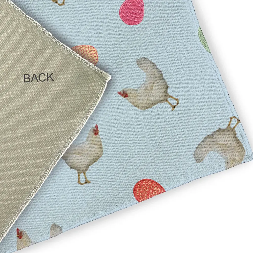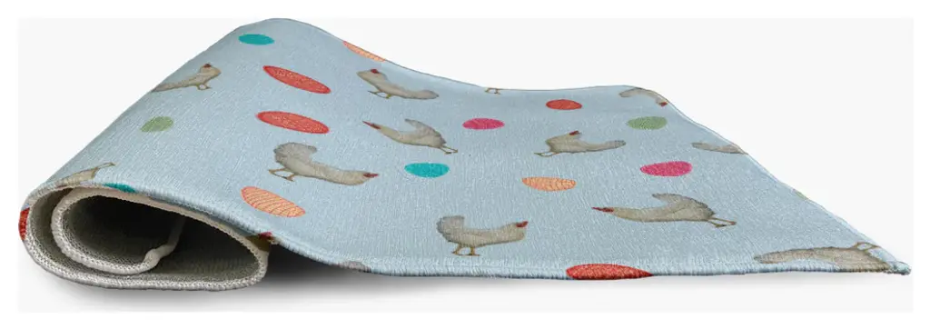 Enjoy a new style this season with a Chickens and Eggs Indoor/outdoor Rug from our Funky Junky Collection. Everyone will delight in the space defining design brought to your porch, patio, kitchen, or bathroom by this area rug. The artistic and colorful design is printed on a soft polyester base with a skid resistant backing, making it a perfect way to add color, flare and personality to any indoor or outdoor space. To clean, use a mild soap and lay flat to dry.