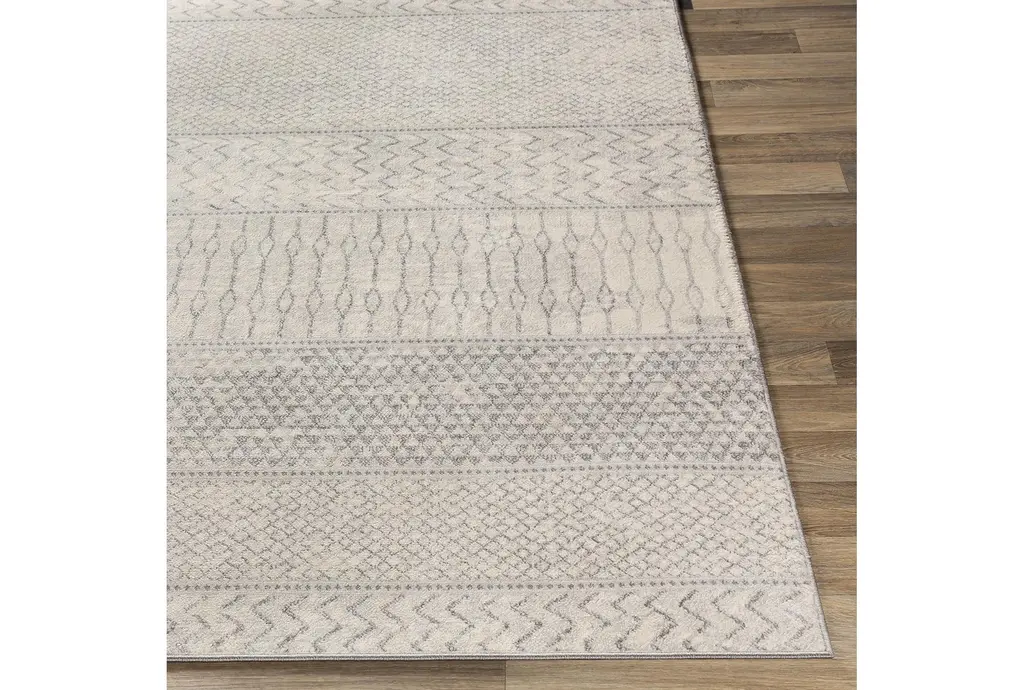 Enhance your indoor space with the 4'3"x5'9" Fiber Rug by Surya, featuring a global muted stripe design in silver grey, medium grey, and cream. This modern area rug brings a touch of Scandinavian charm to any room with its soft, neutral colors and geometric pattern. The low pile ensures easy maintenance and comfortable underfoot feel.