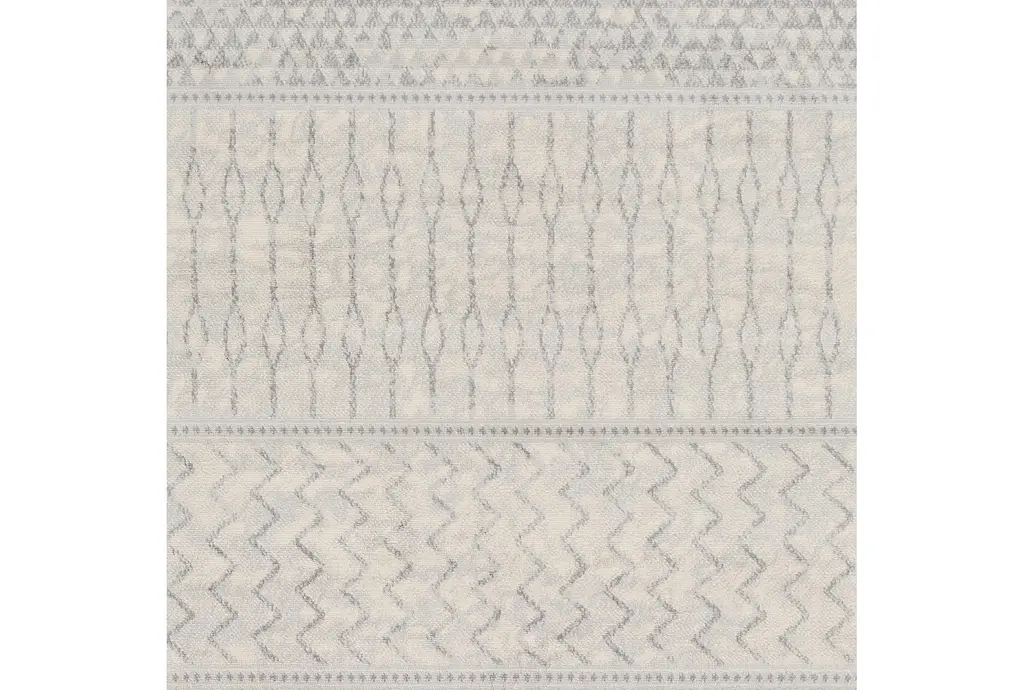 Enhance your indoor space with the 4'3"x5'9" Fiber Rug by Surya, featuring a global muted stripe design in silver grey, medium grey, and cream. This modern area rug brings a touch of Scandinavian charm to any room with its soft, neutral colors and geometric pattern. The low pile ensures easy maintenance and comfortable underfoot feel.