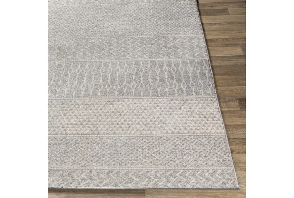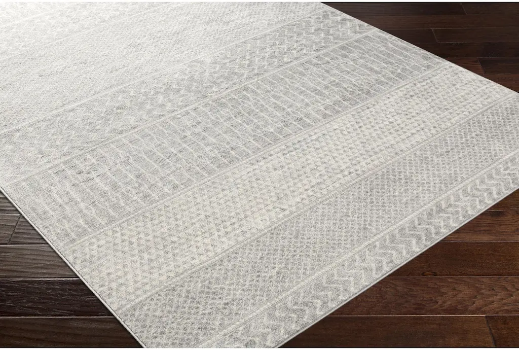 The 4'3"X5'9" Rectangle Fiber Rug in Silver Chevron Pattern by Surya is a perfect addition to any indoor living space. This low-pile rug offers a modern aesthetic with its soft color palette of silver grey, medium grey, and cream. Its polypropylene fiber construction ensures durability and easy maintenance, making it ideal for high-traffic areas.
