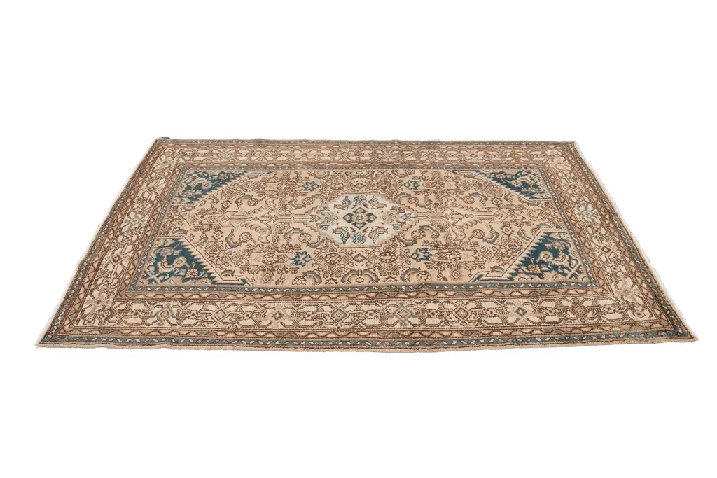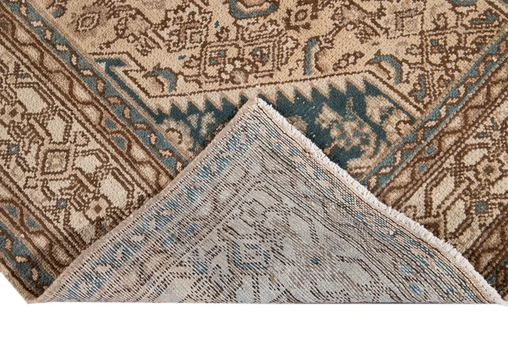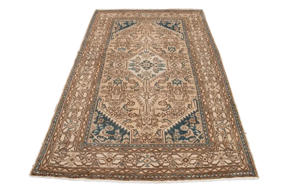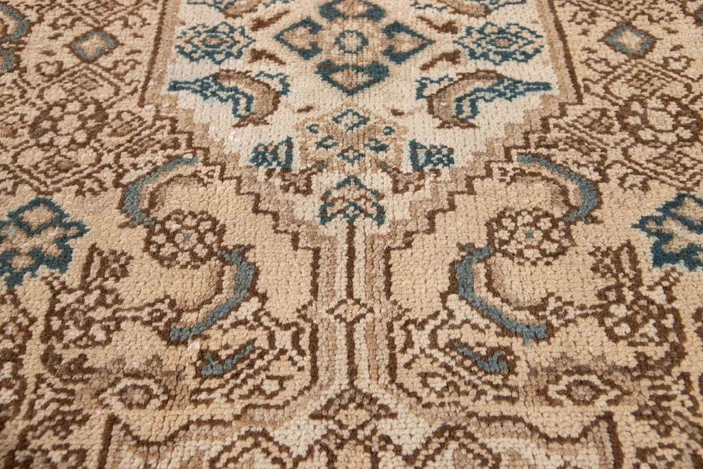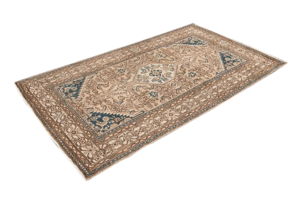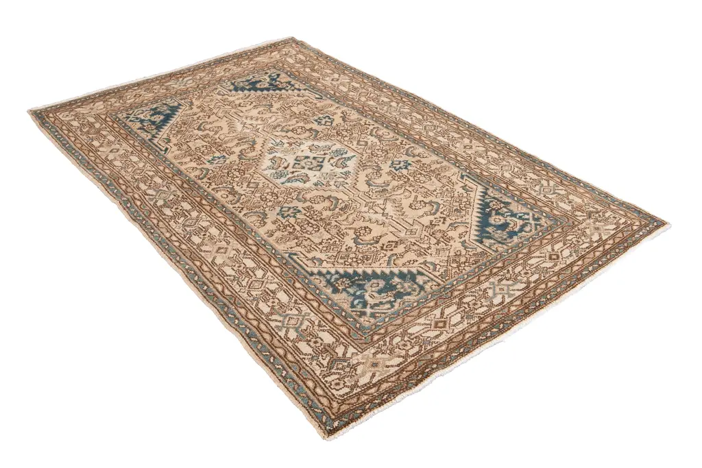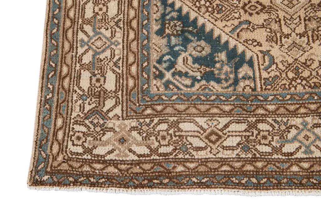 A beautiful vintage hand-knotted wool rug with a beige field and blue accents in an all-over distressed geometric medallion design.This rug measures: 4'4'' x 7'