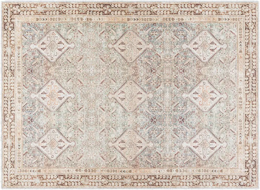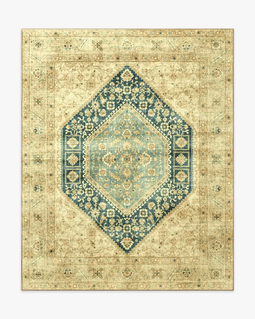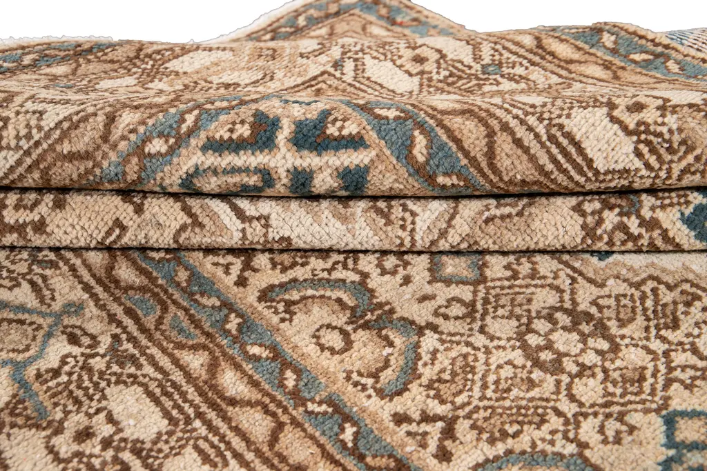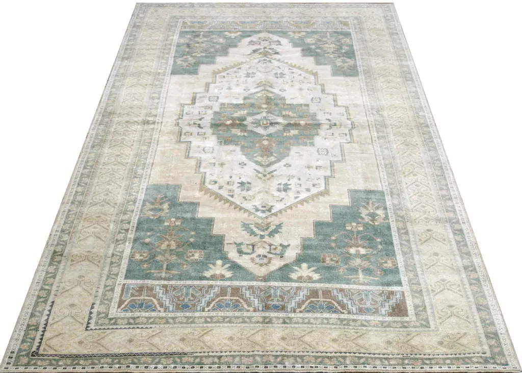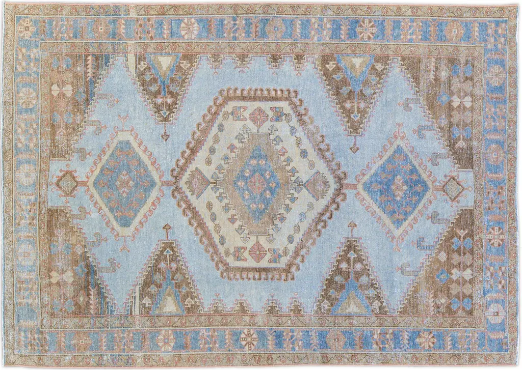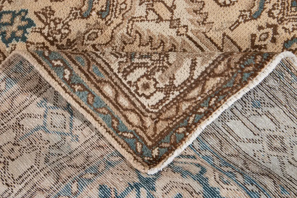 A beautiful vintage hand-knotted wool rug with a beige field and blue accents in an all-over distressed geometric medallion design.This rug measures: 4'4'' x 7'