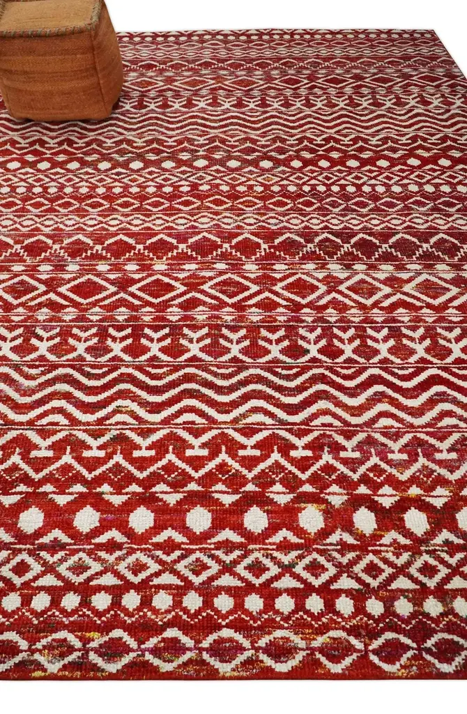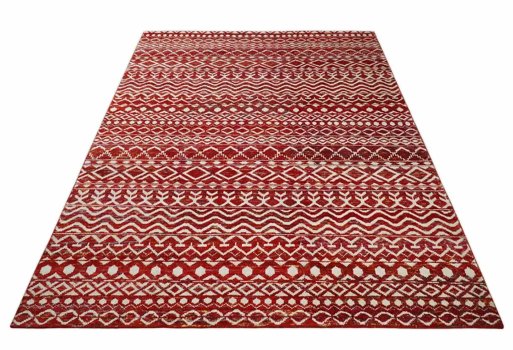4X6 And 9X12 Hand Knotted Rust And White Modern Contemporary Southwestern Tribal Trellis Recycled Silk Area Rug | Op7 - 9X12