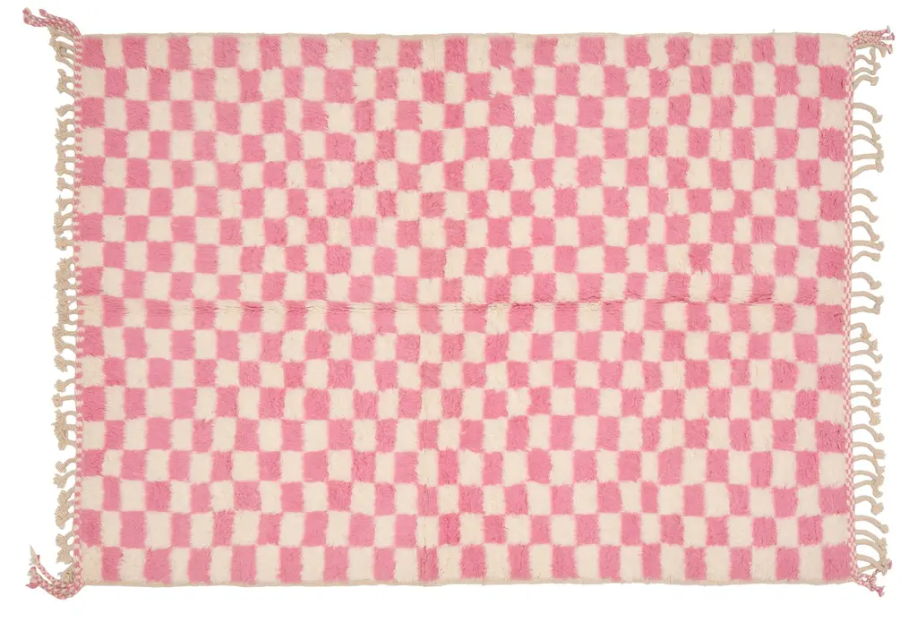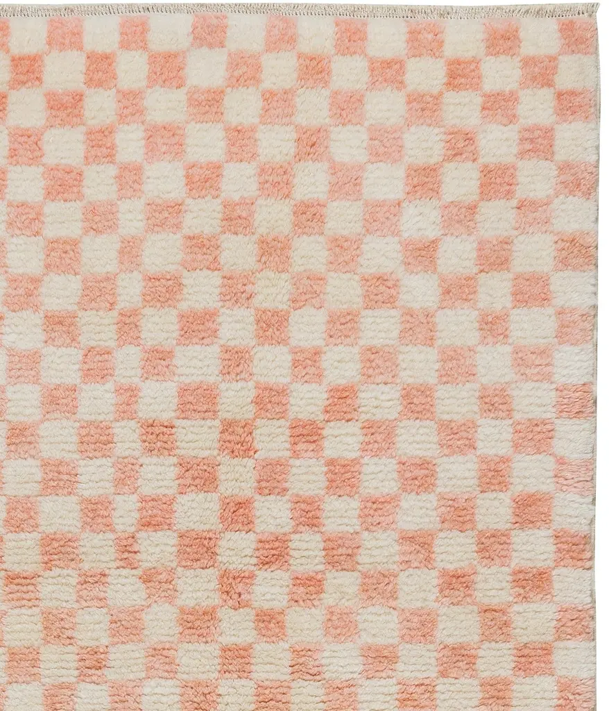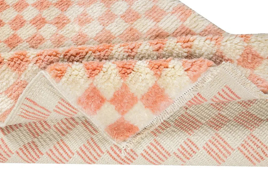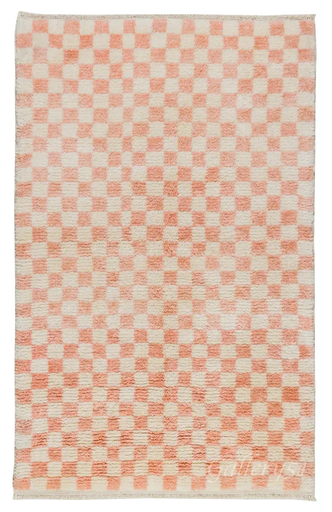 4X6 Ft Handmade Checkered Design Tulu Rug In Soft Pink & Beige. 100% Wool