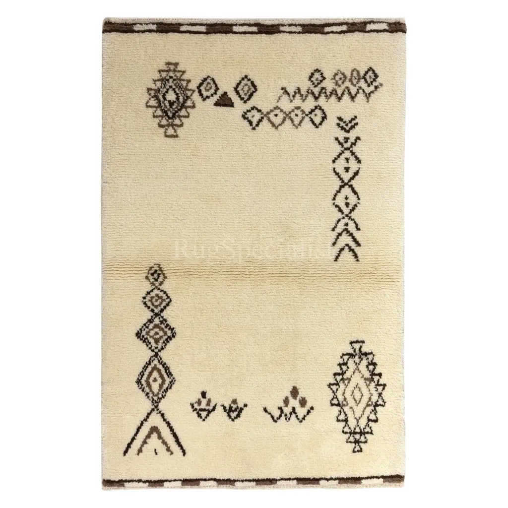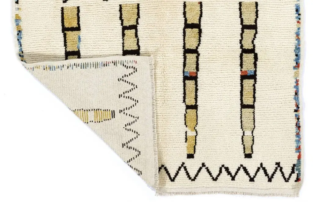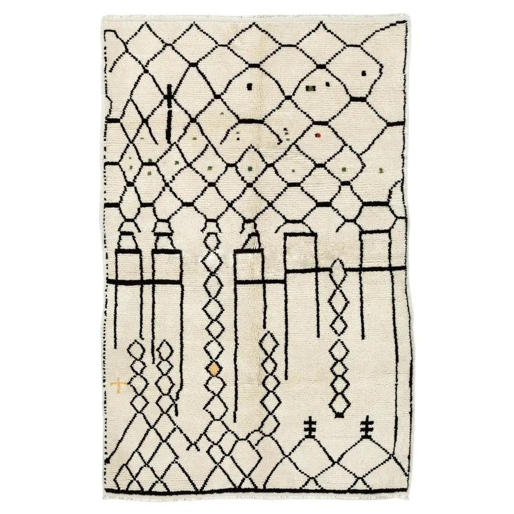A modern hand-knotted Moroccan rug featuring a quirky minimalist design, made of natural un-dyed ivory and brown wool with hints of colored wool in places. It has soft, thick pile that feels very comfortable under feet. Size: 5.2 x 8.3 FtAvailable as it is or customizable in any size and color combination, ready within 4-6 weeks.