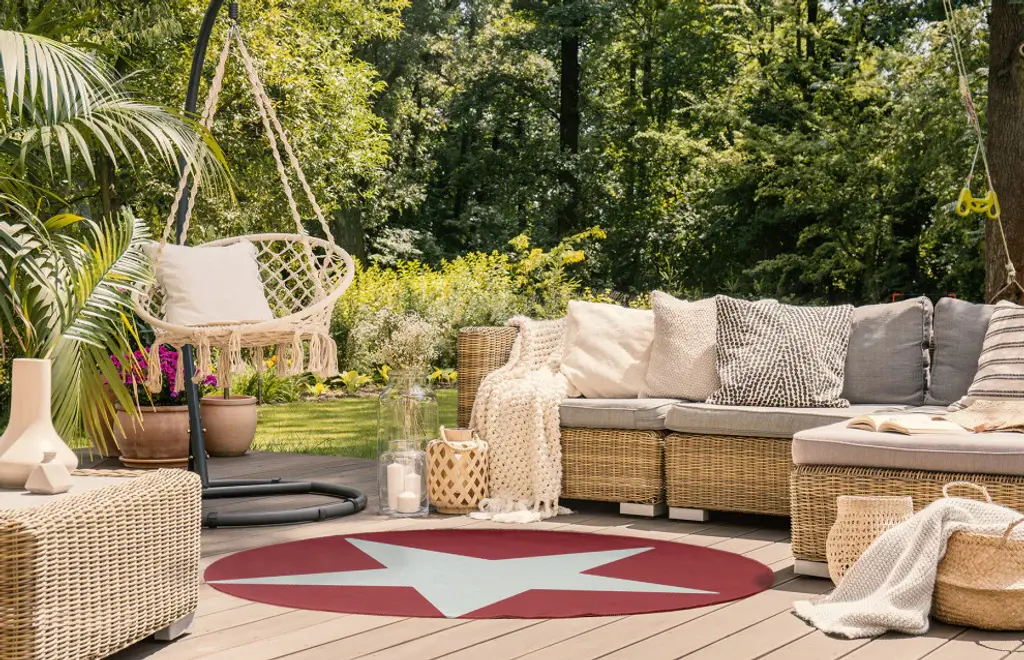 Enjoy a new style this season with a Big Star Indoor/outdoor Rug from our Funky Junky Collection. Everyone will delight in the space defining design brought to your porch, patio, kitchen, or bathroom by this area rug. The artistic and colorful design is printed on a soft polyester base with a skid resistant backing, making it a perfect way to add color, flare and personality to any indoor or outdoor space. To clean, use a mild soap and lay flat to dry.Soft underfoot, made of textured ChenilleStylish and functional to enliven your outdoor d?corSerged edgesCoated skid-resistant backingQuick-dry constructionStiff, lay-flat design